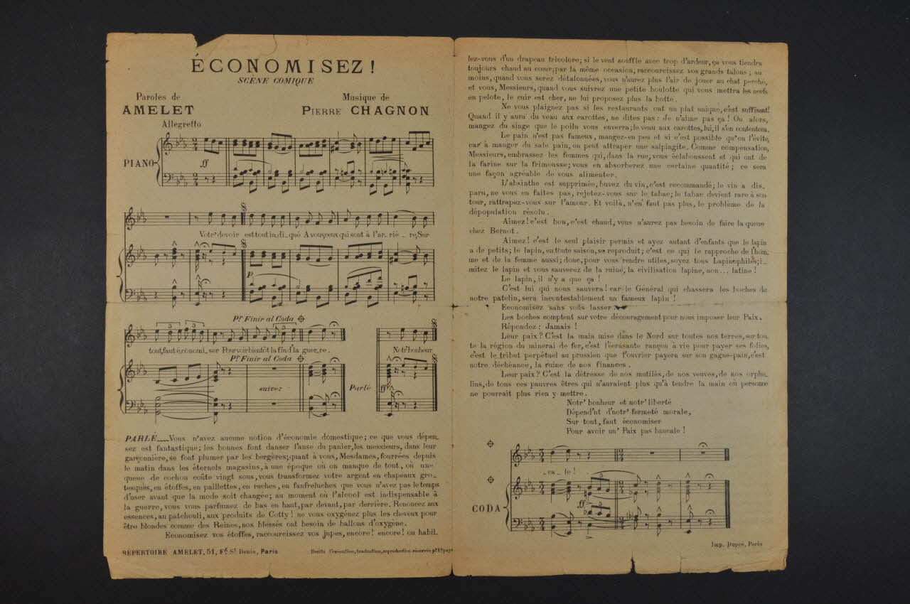 Les inscriptions renseignent le titre de la chanson, le nom des auteurs, de l'artiste et de l'éditeur. A l'intérieur, la partition et les paroles. Au dos, une liste de titres disponibles chez le même éditeur. Des bandes adhésives renforcent les pliures.Décor