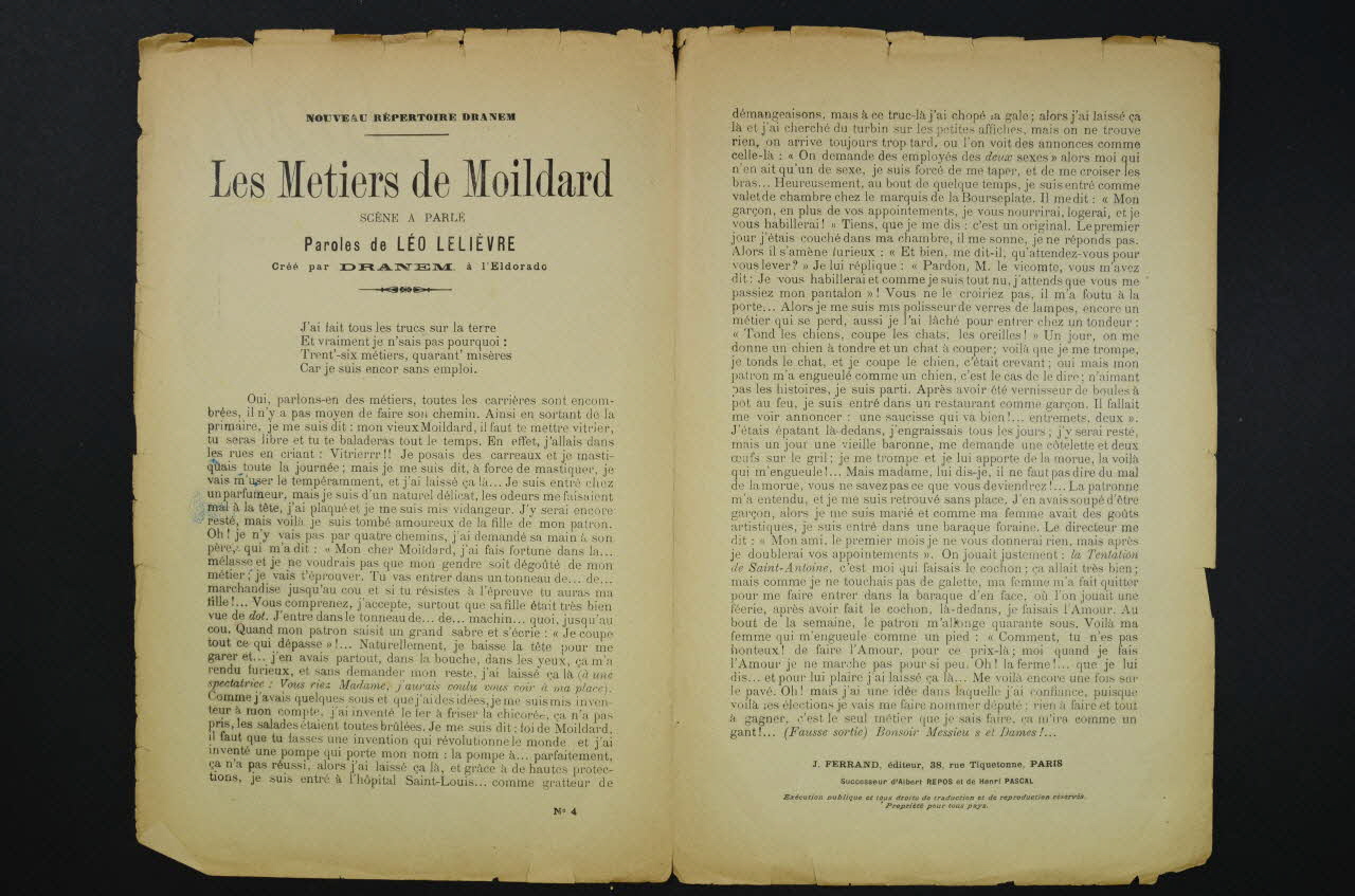 Feuillet rectangulaire en papier industriel imprimé à l'encre polychrome (sauf à l'intérieur, encre noire). Sur la couverture, une caricature de Dranem.