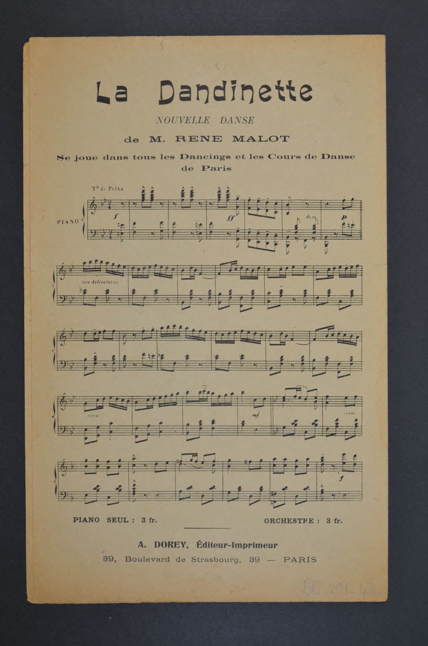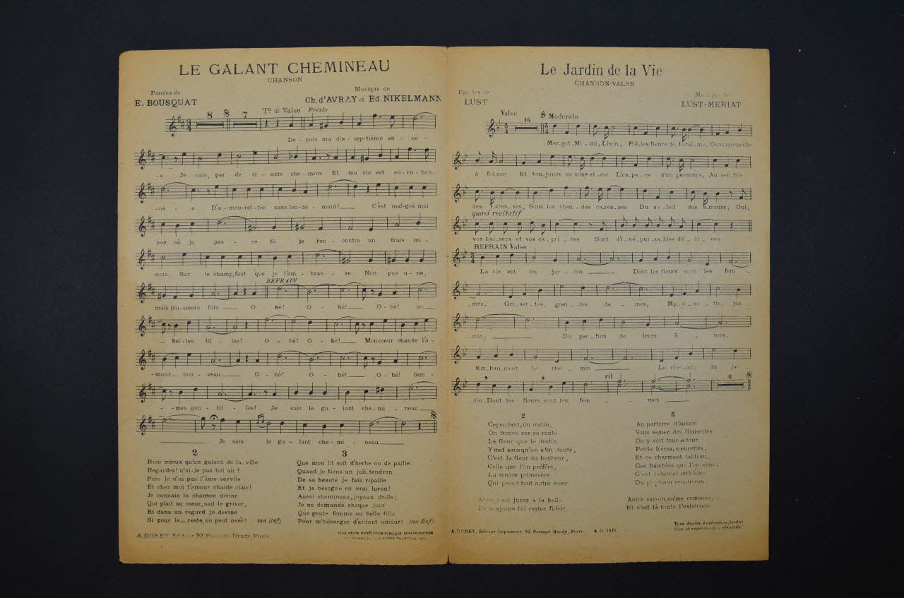 Feuillet rectangulaire en papier industriel imprimé. Le feuillet contient la partition et les paroles de la chanson. Au dos, publicité pour l'éditeur.