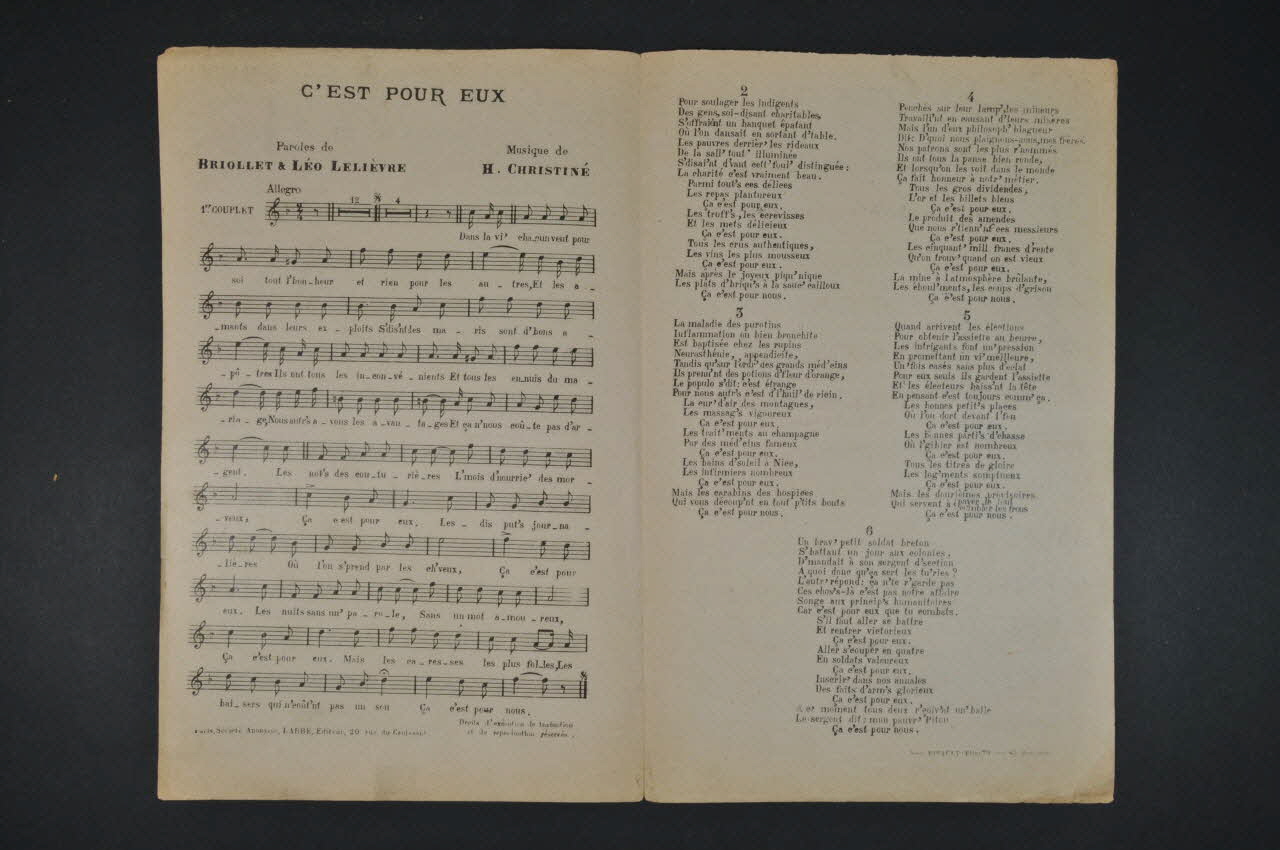 Des inscriptions renseignent le titre, les auteurs, les exécutants et l'éditeur. A l'intérieur, partition et paroles de la chanson. Au dos, liste d'autres partitions publiées par l'éditeur.Matériaux et techniques