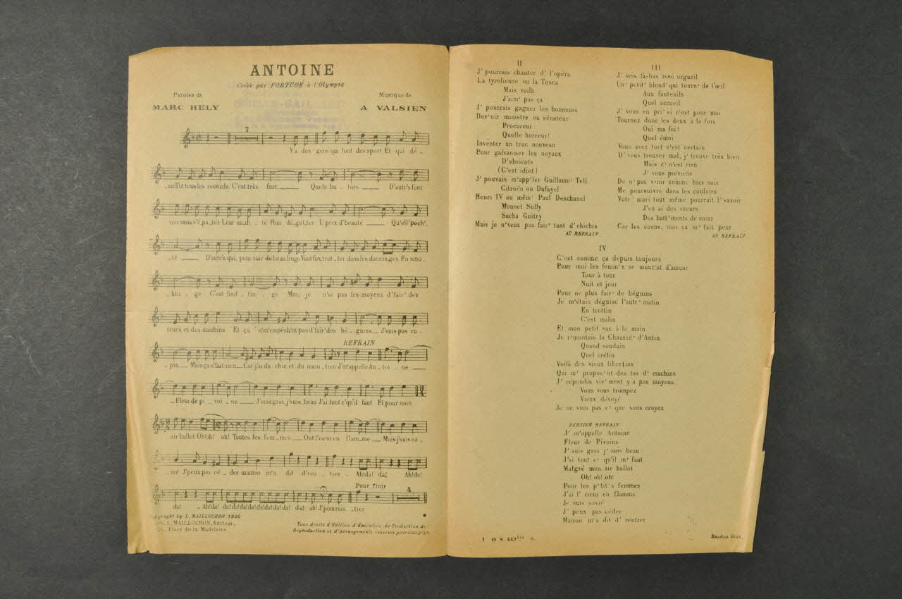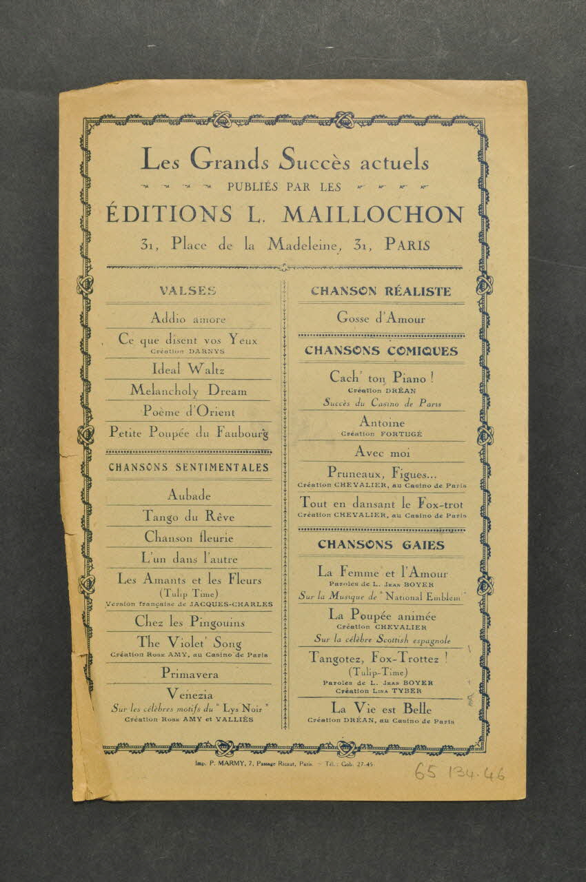 Les inscriptions renseignent le titre de la chanson, le nom des auteurs, de l'artiste et de l'éditeur. A l'intérieur se trouvent la partition et les paroles de la chanson. Au dos, une liste d?autres partitions publiées par l?éditeur.Décor
