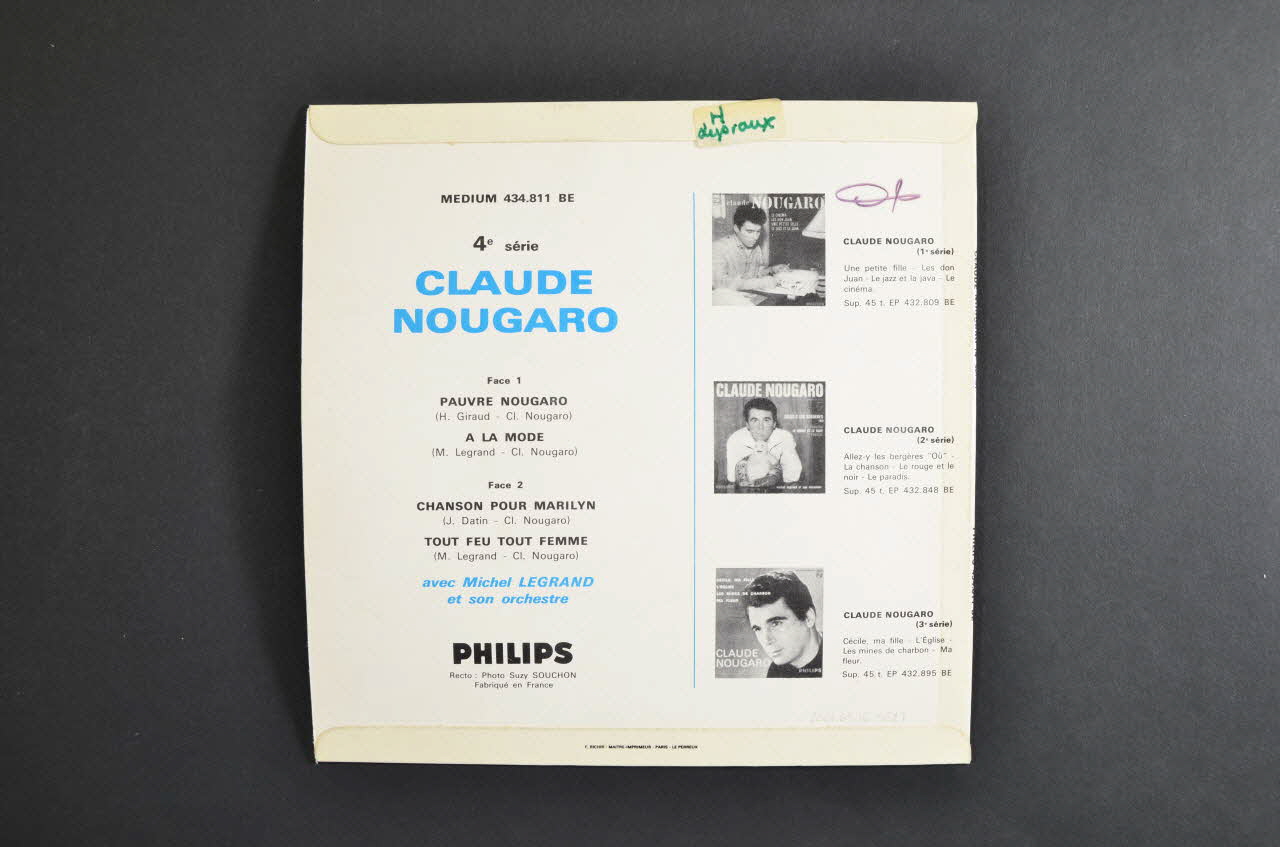 Le recto comporte une photographie couleur du chanteur. Le nom de l'artiste en rose et les titres des chansons en bleu sont inscrits dans la partie supérieure sur une bande blanche. Le logo de l'éditeur est dans l'angle inférieur gauche. Le verso contient le nom de l'artiste, les titres des chansons. Trois autres albums sont présentés en noir et blanc. Dans la partie supérieure, il y a une étiquette blanche collée avec le nom du donateur en vert, et une marque au feutre violet.Matériaux et techniques