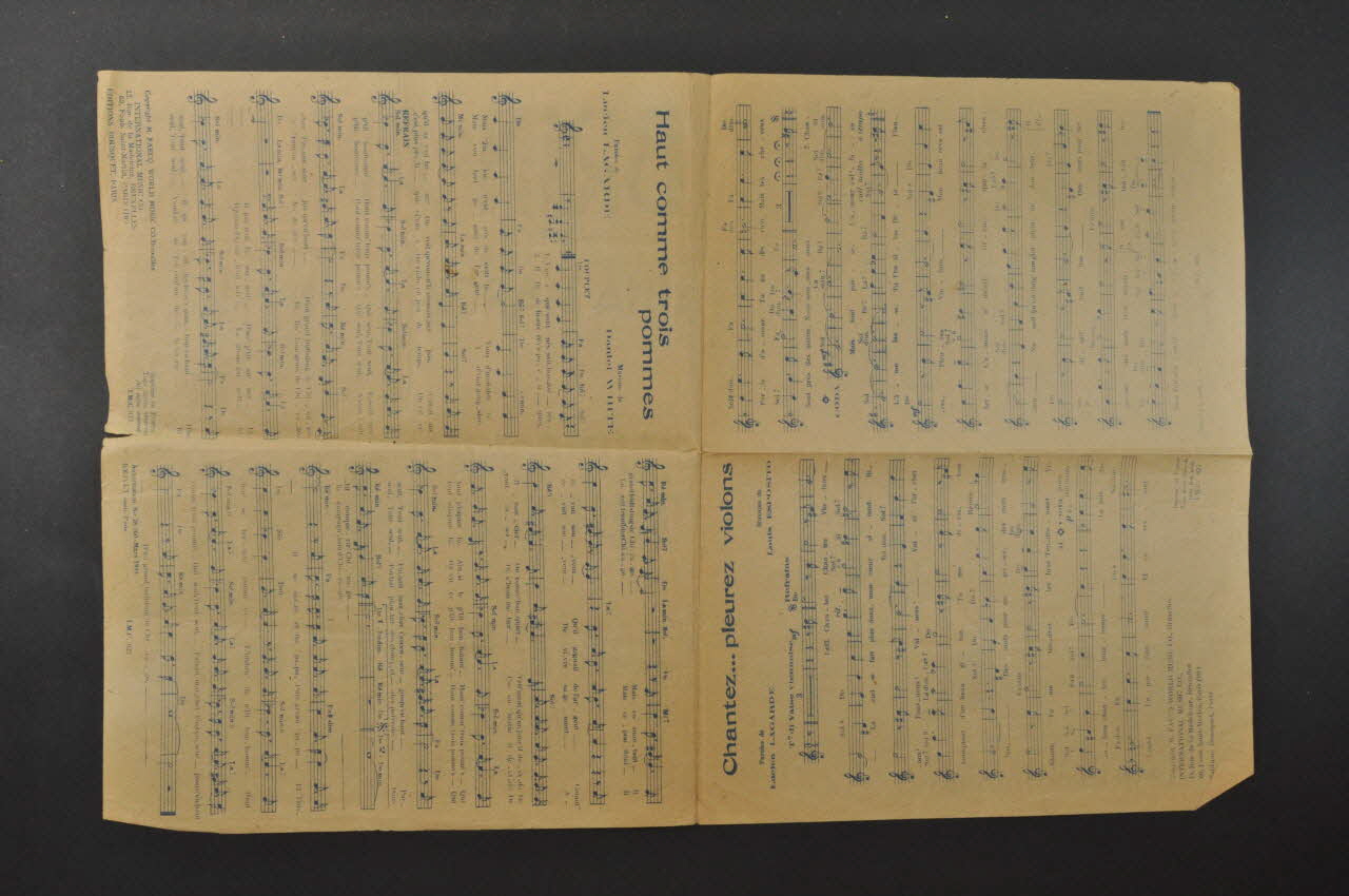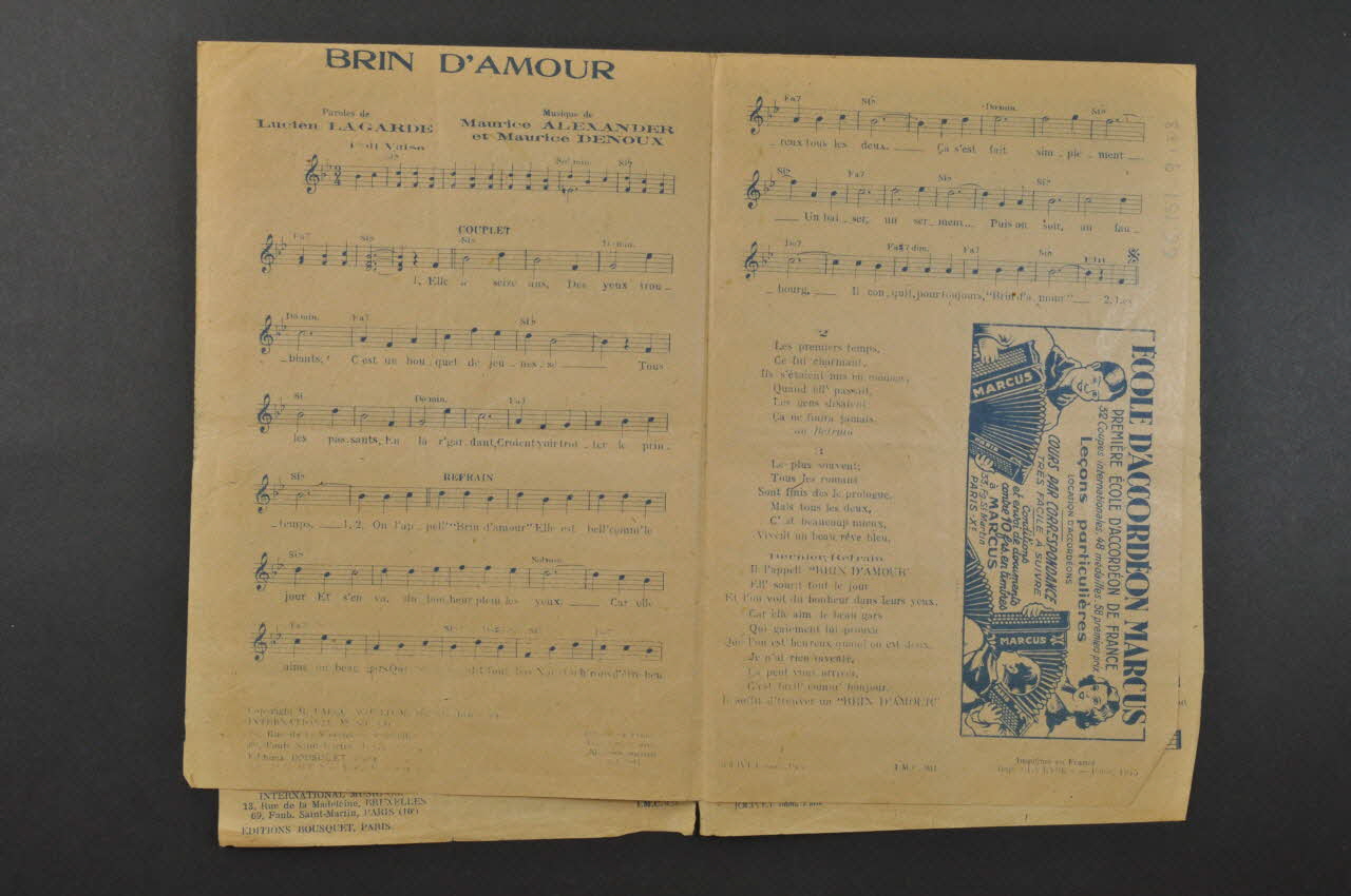 Les inscriptions renseignent le titre de la chanson, le nom des auteurs, de l'artiste et de l'éditeur. A l'intérieur et au dos se trouvent les partitions et paroles de la chanson.Décor