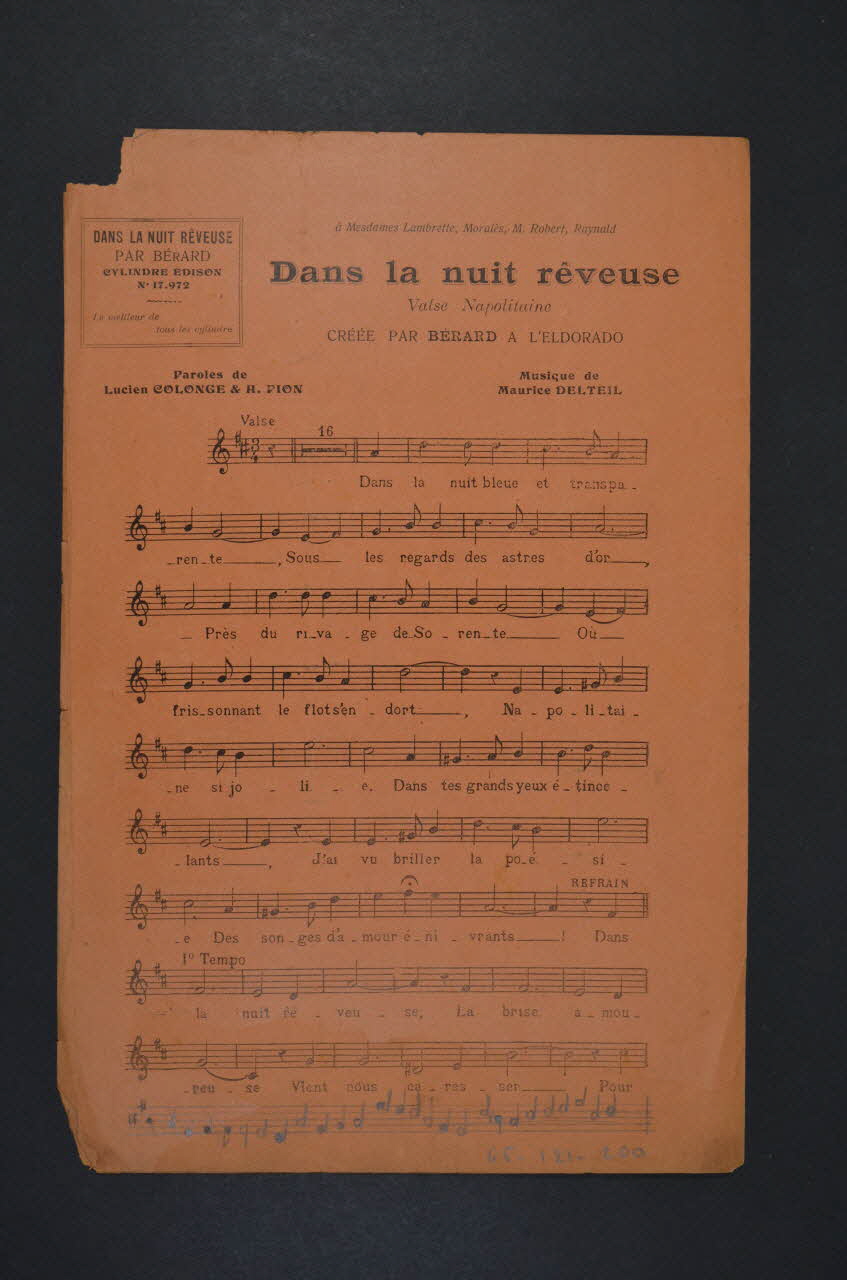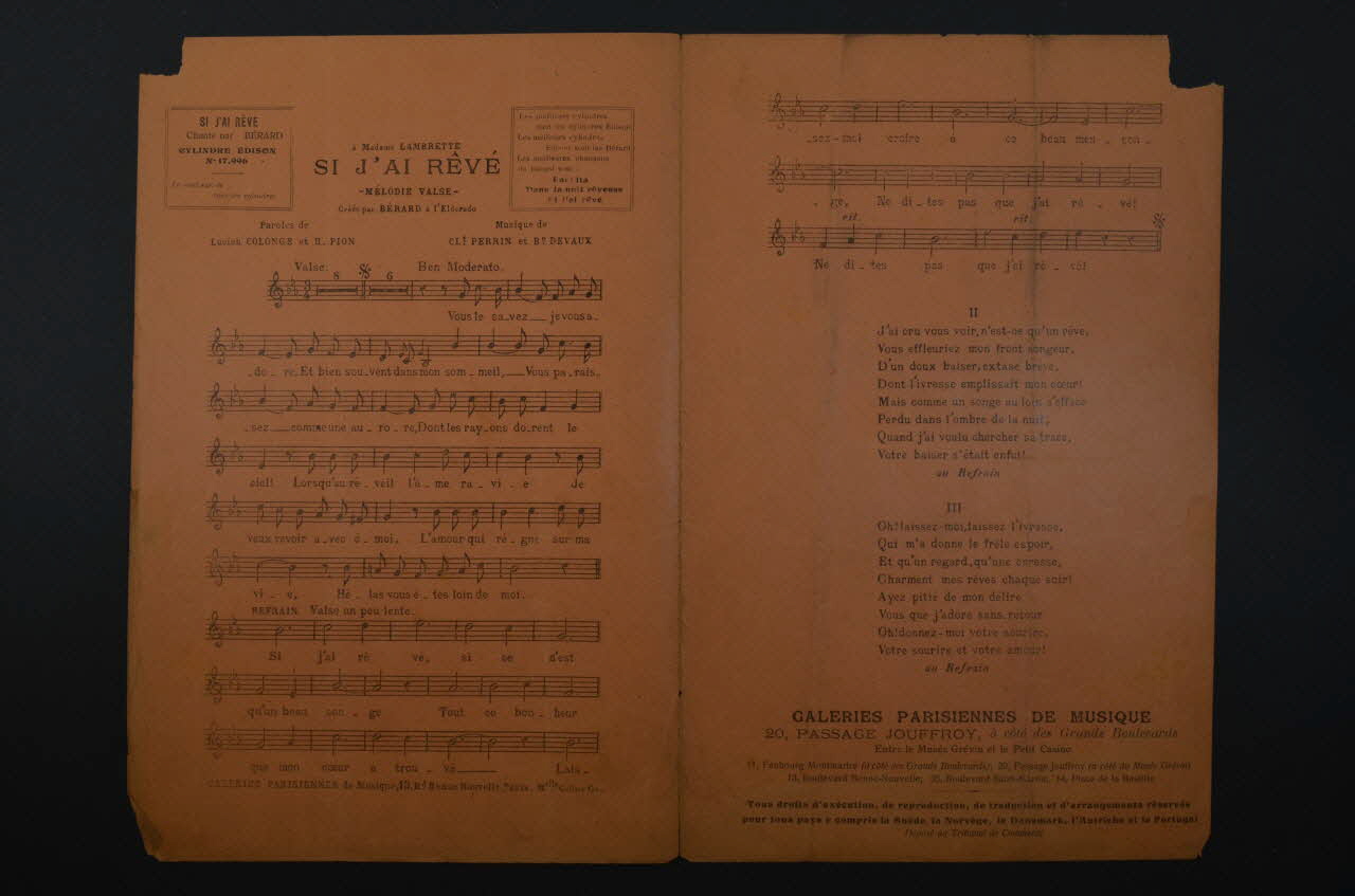 Des inscriptions renseignent le titre, les auteurs, les exécutants et l'éditeur. A l'intérieur et au dos, les partitions et paroles des chansons.Matériaux et techniques