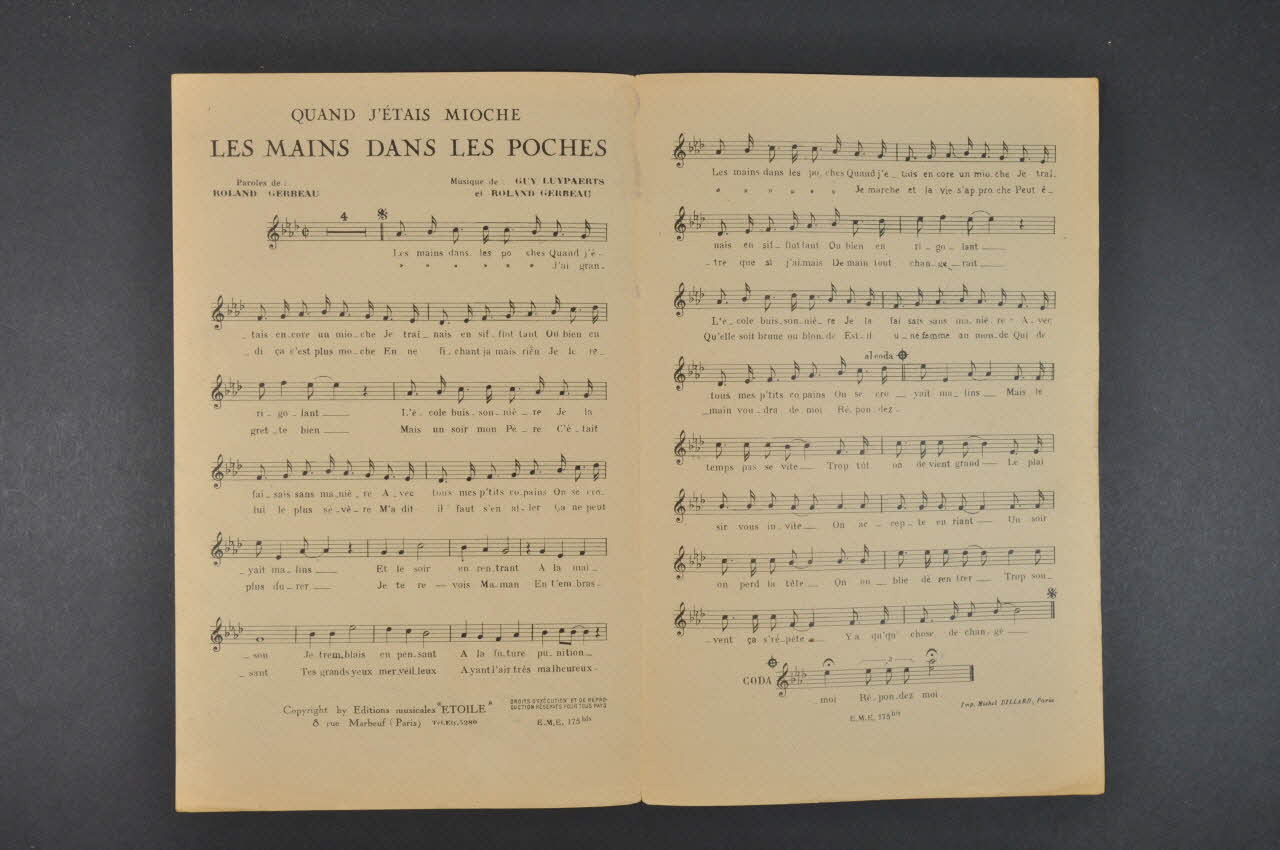 Les inscriptions renseignent le titre de la chanson, le nom des auteurs, de l'artiste et de l'éditeur. A l'intérieur, partitions et paroles de la chanson. Au dos, liste d?autres partitions publiées par l?éditeur.Décor