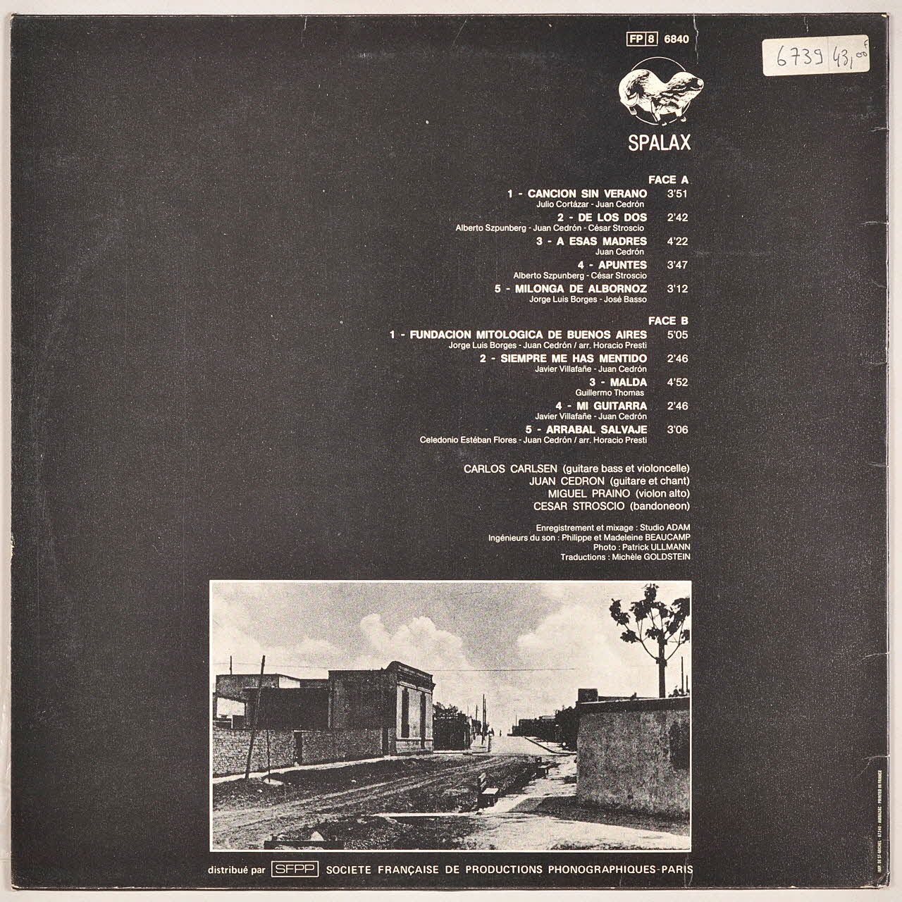 disque 33 tours, Apuntes, Mi Guitarra, Cancion sin Verano, Milonga de Albornoz, Siempre Me Has Mentido, Faubourg Sauvage, Arrabal Salvaje, Fundacion Mitologica de Buenos Aires, De Los Dos, Malda, A Esas Madres
