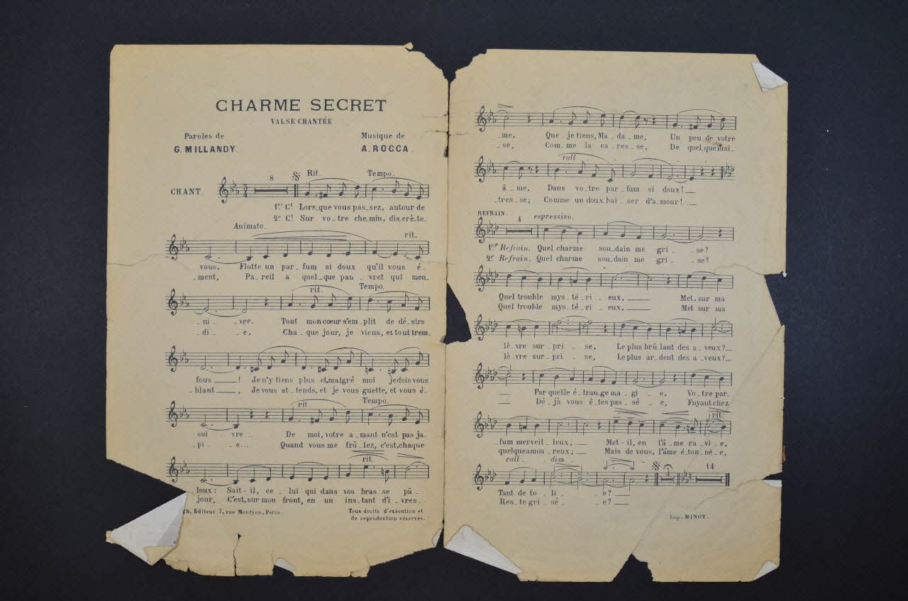 Feuillet rectangulaire en papier industriel imprimé. Le feuillet contient la partition et les paroles de la chanson. Au dos, publicité pour l'éditeur.Matériaux et techniques