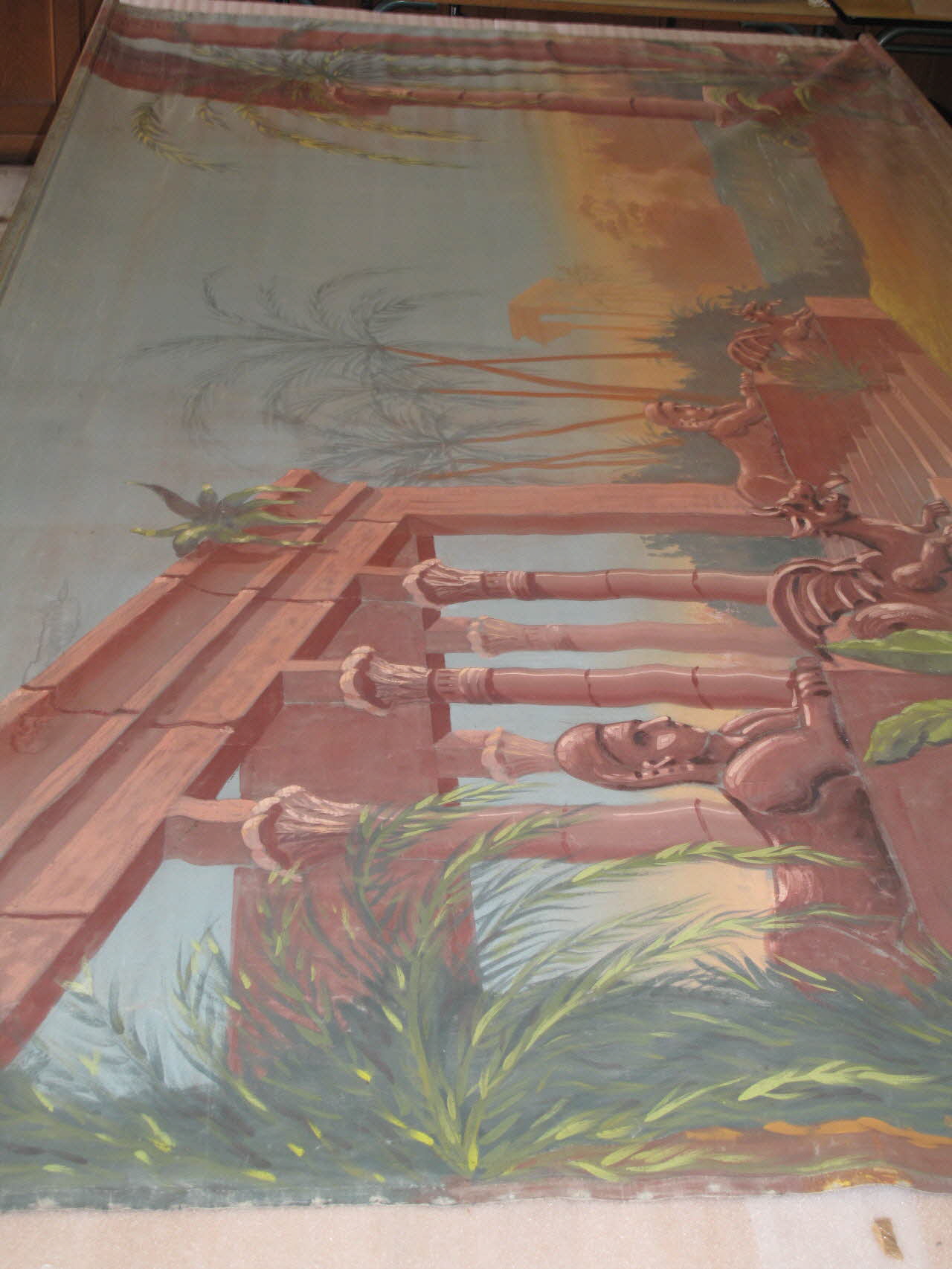toile peinte à la colle, fixée aux extrémités entre deux baguettes de suspension en bois clouées entre elles / toile de fond peinte sur les deux faces ; au recto : temple mexicain, pour "les Pirates de la Savane" (deux sphinx et deux dragons ailés de chaque côté d'une colonnade, végétation luxuriante) ; au verso : la mansarde (papier peint bleu canard rayé, fenêtre, armorie, commode) ; deux barres de suspension clouées (deux barres serrant la toile clouées ensemble) et systèmes d'accroche (lacets et crochets)Inscriptions
