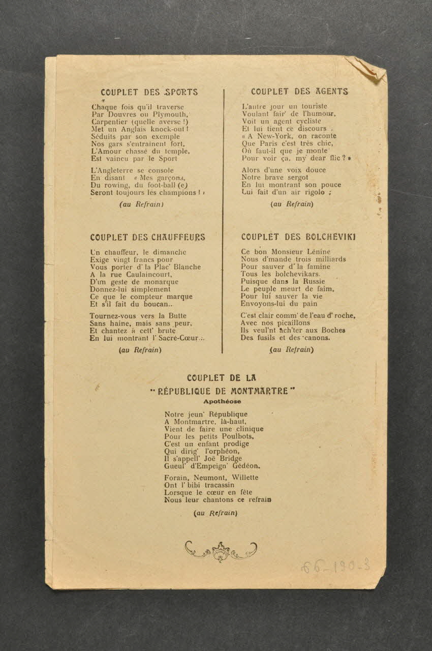 Des inscriptions renseignent le titre, les auteurs, les exécutants et l'éditeur. A l'intérieur et au dos, partition et paroles de la chanson.Décor