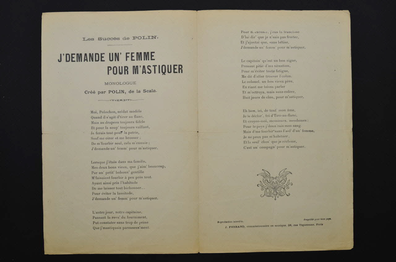 Sur la couverture, la représentation du chansonnier Polin en tenue militaire mordillant un mouchoir ; encadrement d'arabesques et de guirlandes de gui. Les inscriptions renseignent le titre de la chanson, le nom des auteurs, de l'artiste et de l'éditeur. A l'intérieur, partition et paroles de la chanson. Au dos, liste d'autres partitions publiées par l'éditeur.Décor