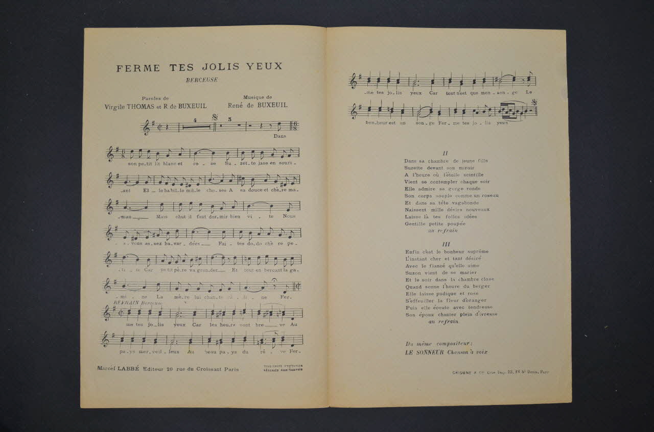 Sur la couverture, le portrait photographique de René de Buxeuil jouant du piano. Les inscriptions renseignent le titre de la chanson, le nom des auteurs, des artistes et de l'éditeur. A l'intérieur, partition et paroles de la chanson. Au dos, liste d'autres partitions publiées par l'éditeur.Décor