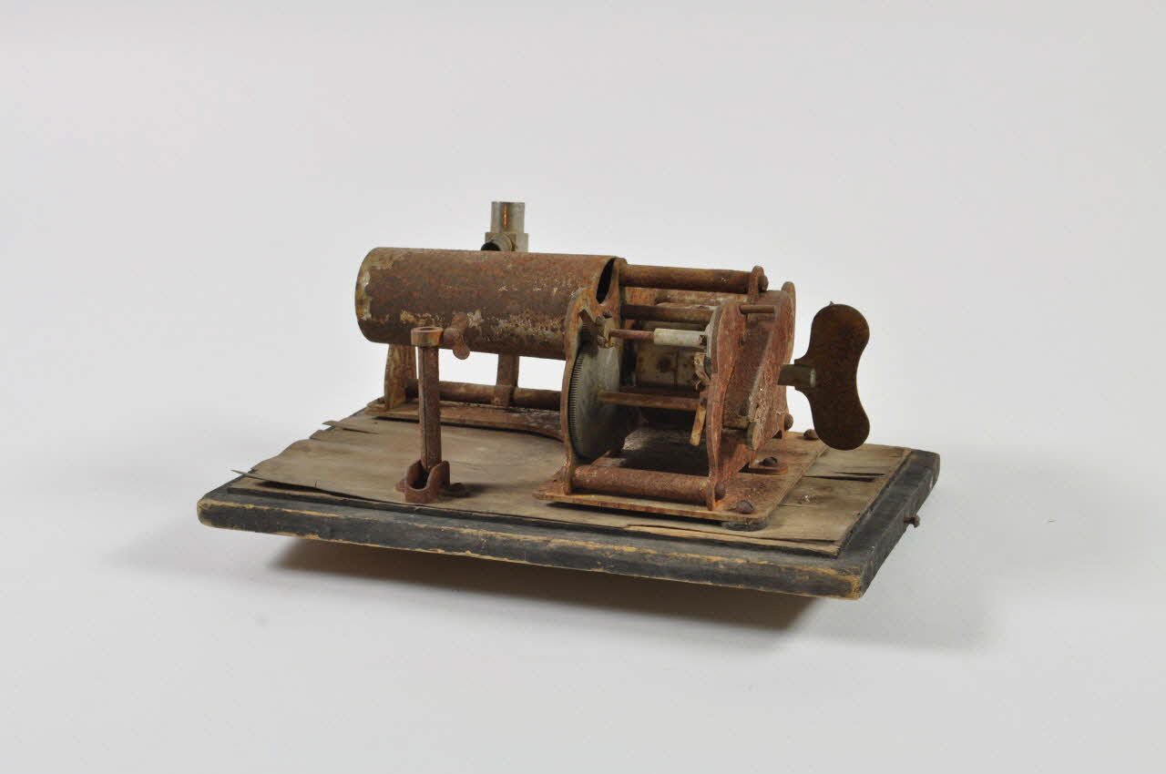 Lecteur de cylindre Edison et mécanisme en métal muni d'une clé, fixé sur une planchette de bois. Une petite poignée mobile est rivetée sur l'autre face.Matériaux et techniques