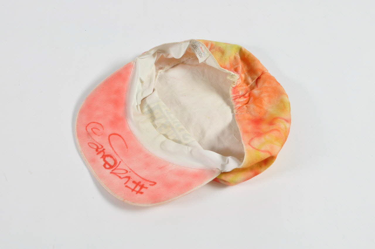 Casquette cylindrique plate sur le dessus ressérée à l'arrière par un élastique, en coton blanc, "customisée" par l'utilisateur : peinte à la bombe aérosol de motifs abstraits de couleur jaune, orange et rouge. On trouve sur l'avant, au centre un cadre carré noir inscrit en rouge et noir : VISION STREET WEAR. Un graffiti est inscrit en rouge sous la visière et un nom est inscrit au stylo à bille bleu, à l'intérieur. Une bande de plastique est cousue sur le bord, à l'intérieur.Inscriptions