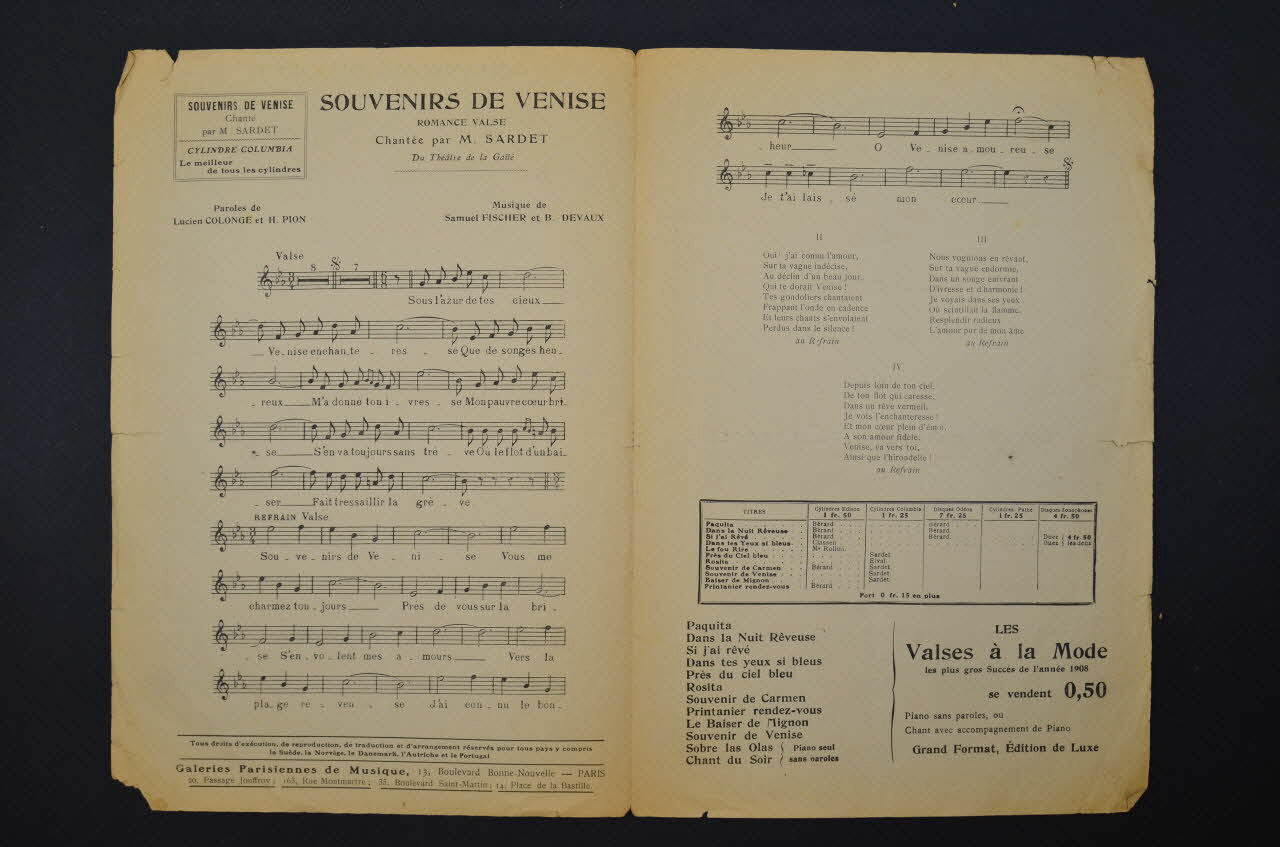 Feuillet rectangulaire en papier industriel imprimé. Le feuillet contient la partition et les paroles de la chanson. Au dos, publicité pour l'éditeur.Décor
