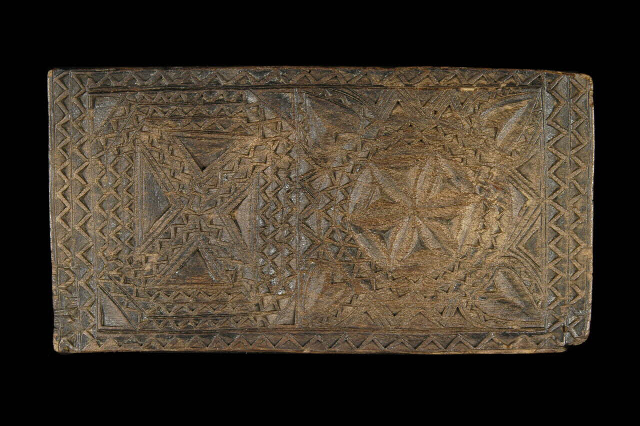 Bois taillé / Rectangulaire. Décor géométrique. D'un côté une rosace à 6 feuilles entourée de dents de scie, 4 coeurs, dents carrées à pans coupes, diagonal décoré dents de scie, encadrement dents de scie combinées en losange, l'autre côté motif à 5 rosaces, celles de centre à branches courbes, panneau en croisillons, encadrement dents de scieDécor