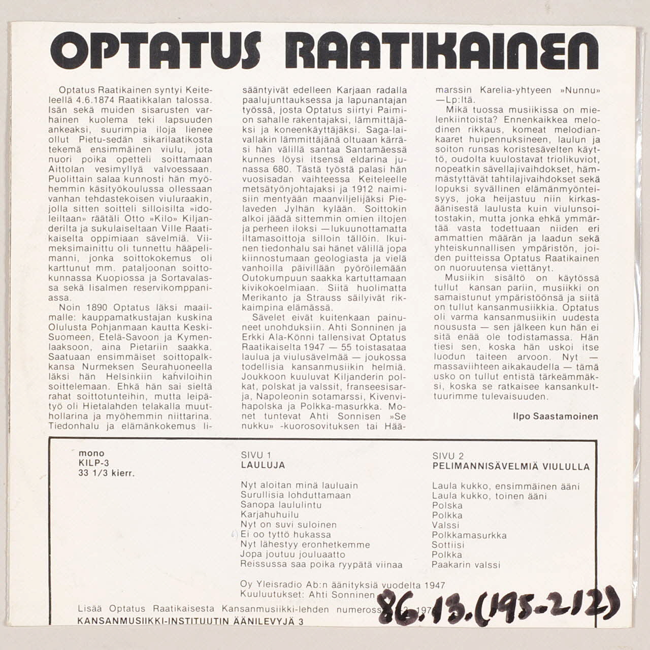 disque 33 tours, Optaatus Raatikainen