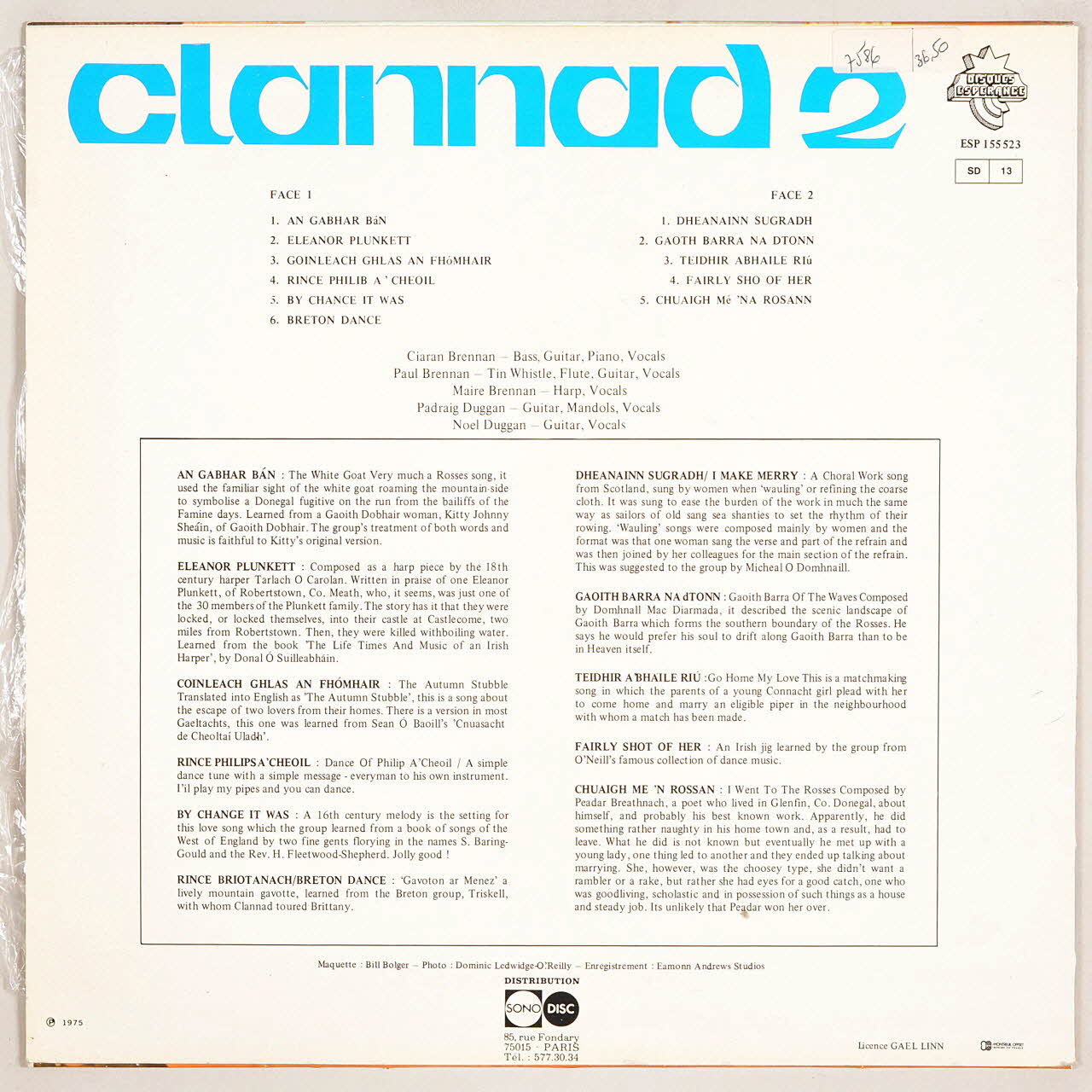 disque 33 tours, Rince philib a'cheoil, Teidhir abhaile riu, An Gabhar Bàn, By chance it was, Dheanainn sugradh, Clannad 2, Fairly sho of her, Breton dance, Eleanor plunkett, Gaoth barra na dtonn, Chuaigh mé 'na rosann, Goinleach ghlas an Fhomhair