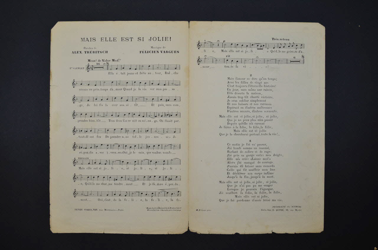 Sur la couverture, le portrait photographique de Joanyd inscrit sur un écu à enroulements, suspendu par une chaîne à une potence, et environné de feuillages grimpant le long de la barre transversale ; au-dessus des noms des auteurs, inscrits sur une bannière, la représentation d'une chimère sculptée, sur le mât, volutes orfèvrées. Les inscriptions renseignent le titre de la chanson, le nom des auteurs, de l'artiste et de l'éditeur. A l'intérieur, partition et paroles de la chanson. Au dos, liste d'autres partitions publiées par l'éditeur dans un encadrement d'arabesques dans la style Art Nouveau.Décor