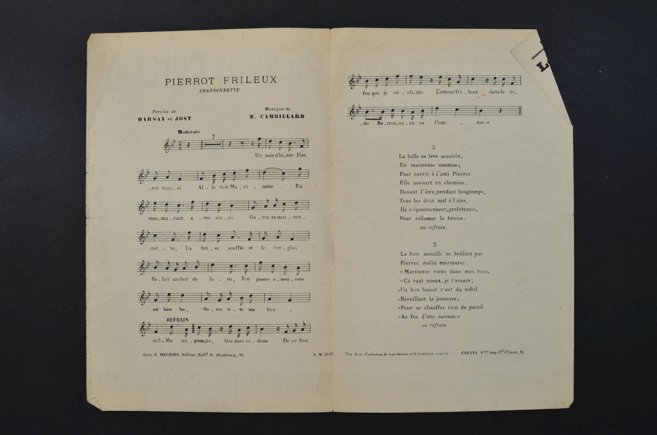 procédé d'imitation photomécanique bleue et blanc / Feuillet rectangulaire en papier industriel imprimé à l'encre. L'intérieur comporte les paroles et la partition de la chanson. Au dos, publicité pour l'éditeur