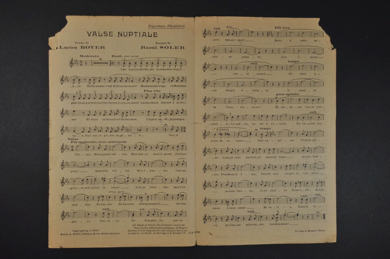 Des inscriptions renseignent le titre, les auteurs, les exécutants et l'éditeur. A l'intérieur, partition et paroles de la chanson. Au dos, liste d'autres partitions publiées par l'éditeur.Décor