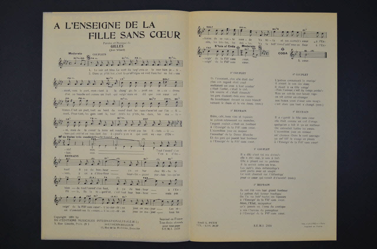 chanson, partition de musique, petit format, A l'enseigne de la fille sans coeur