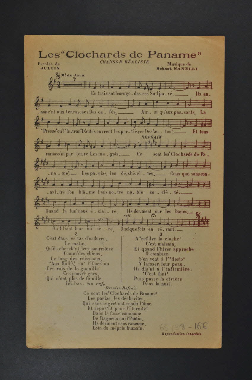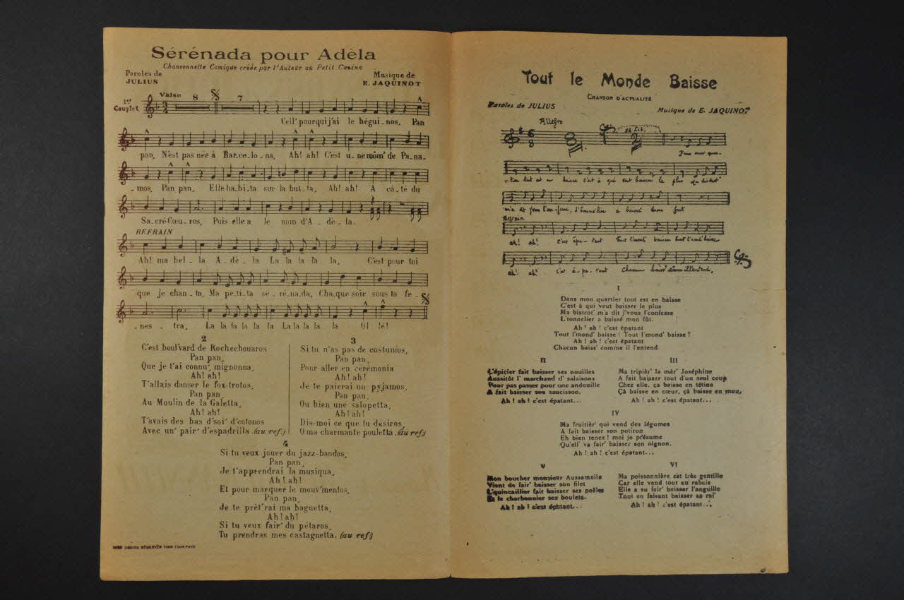 Les inscriptions renseignent le titre de la chanson, le nom des auteurs, de l'artiste et de l'éditeur. A l'intérieur et au dos, les partitions et les paroles.Décor
