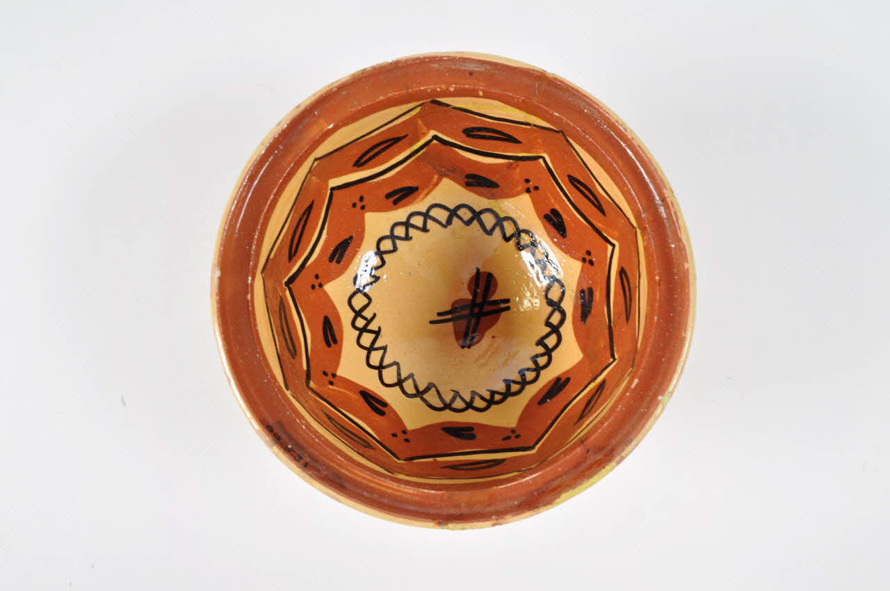 Terre tournée et glaçurée. / Objet de forme circulaire avec un pied-couronne et un rebord. L'extérieur est de couleur beige et l'intérieur montre un décor de guirlandes rouges et noires sur fond jaune.Décor