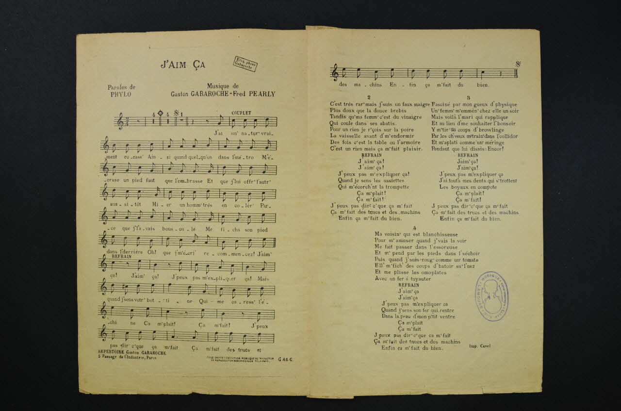 Feuillet rectangulaire en papier industriel, imprimé à l?encre bleue (sauf l?intérieur à l?encre noire). La couverture du feuillet présente des inscriptions renseignant le titre de la chanson, le nom des auteurs, de l'artiste et de l'éditeur.