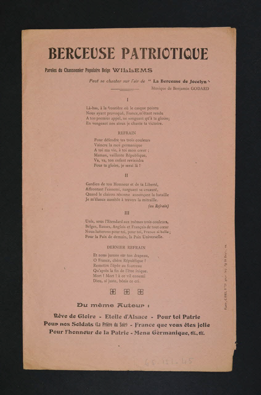 Des inscriptions renseignent le titre, les auteurs, les exécutants et l'éditeur. L'intérieur est laissé vierge. Au dos, les paroles.Matériaux et techniques