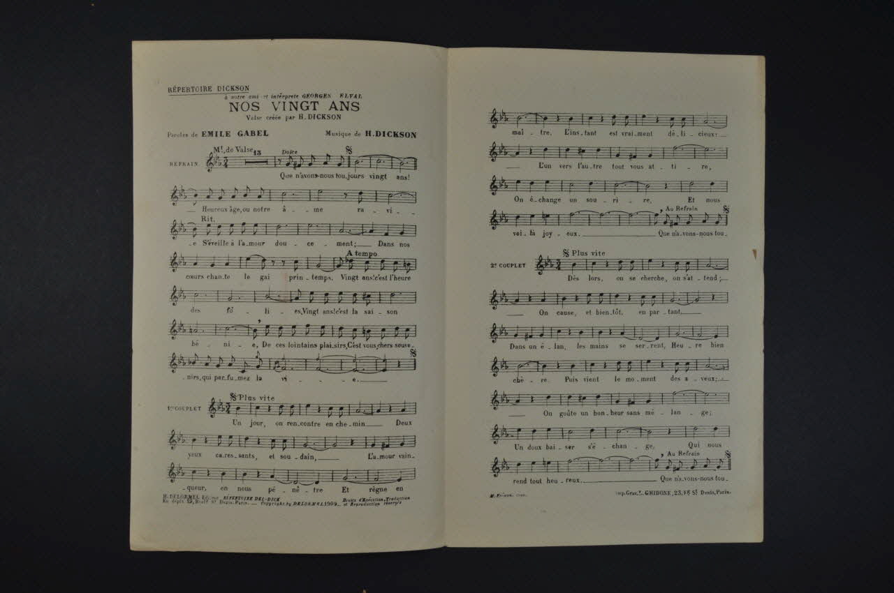 Des inscriptions renseignent le titre, les auteurs, les exécutants et l'éditeur. A l'intérieur, partition et paroles de la chanson. Au dos, liste d'autres partitions publiées par l'éditeur.Décor