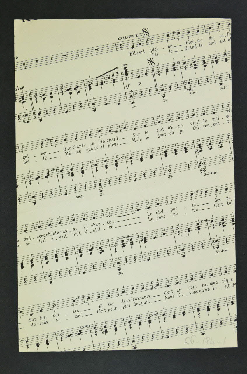 Le recto porte les inscriptions qui renseignent le titre de la chanson, le nom des auteurs, de l'artiste et de l'éditeur. Apparaît également un portrait photographique de la chanteuse Damia, dans un cadre rectangulaire, sur fond de payage urbain nocturne (façade d'immeuble, réverbère, etc.) Au verso, partition tronquée.Décor