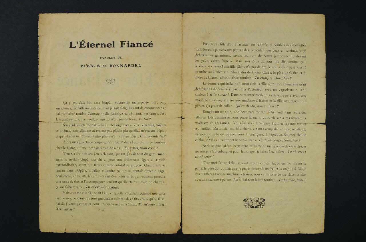 Feuillet rectangulaire en papier industriel, imprimé à l?encre bleue (sauf l?intérieur à l?encre noire). La couverture du feuillet présente des inscriptions renseignant le titre de la chanson, le nom des auteurs, de l'artiste et de l'éditeur.