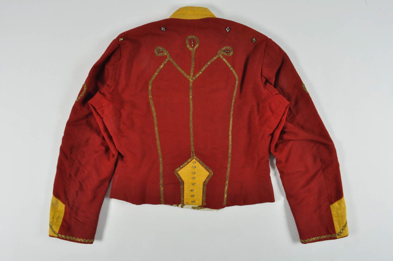 Courte, en toile de coton rouge ; manches longues, ornée sur le bas d'un triangle de satinette jaune, brodé d'un galon de fils métalliques dorés et de petites perles ; petit col officier, en satinette jaune, doublée de toile de coton blanc ; sur l'avant, plastron de flanelle blanche, fermé sur le côté droit pas des pressions métalliques, des boutons en plastique gris et un bouton en métal, et orné de galons de fils métalliques dorés, formant des registres brodés de petites fleurs de toile de coton blanche et rose et de petites perles grises. Le dos de la veste est brodé de rubans de fils métalliques dorés et de petites perles grises.