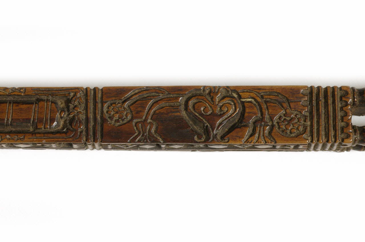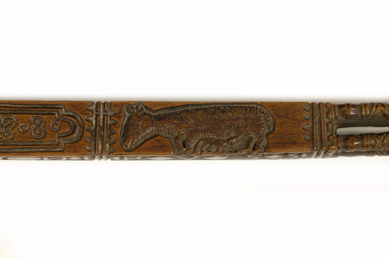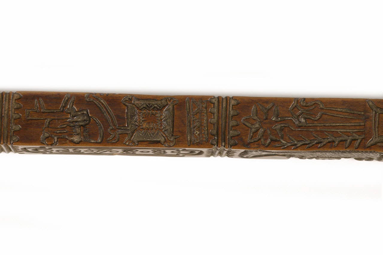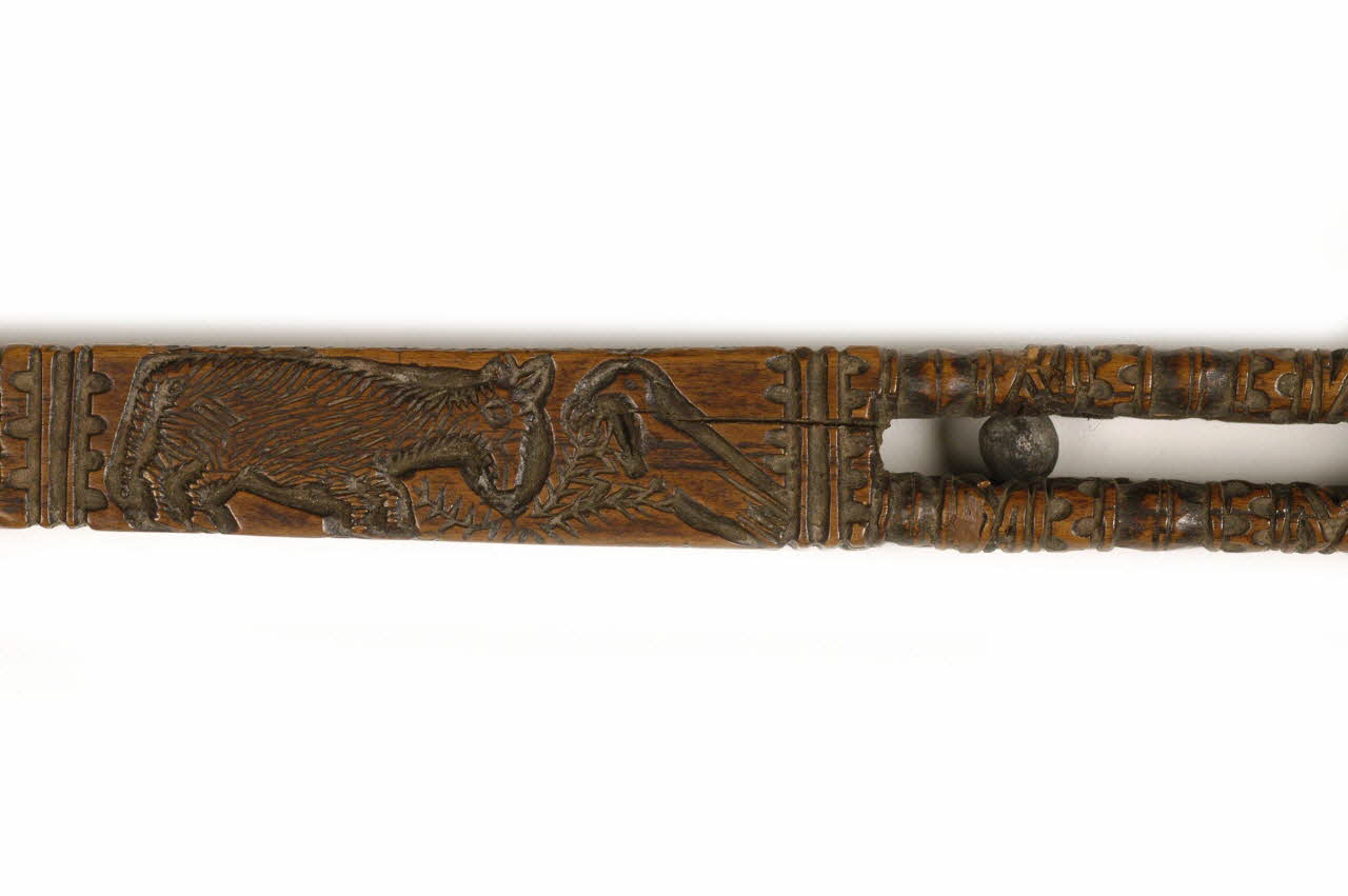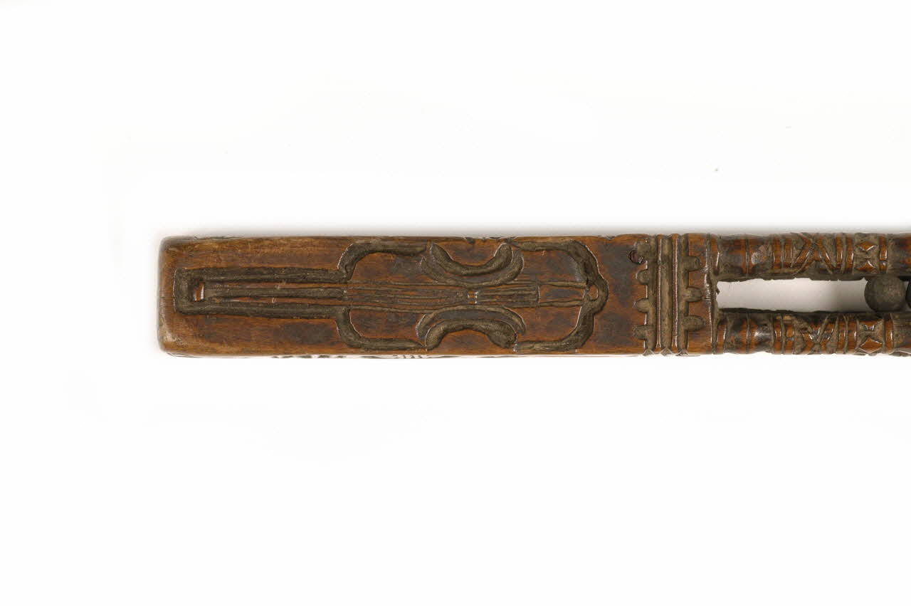 rectangulaire en bois sculpté ; parties évidées avec petites boucles àl'intérieur ; décor : ciseau, agraphe, fleurs, oiseaux, coeur, moutons...