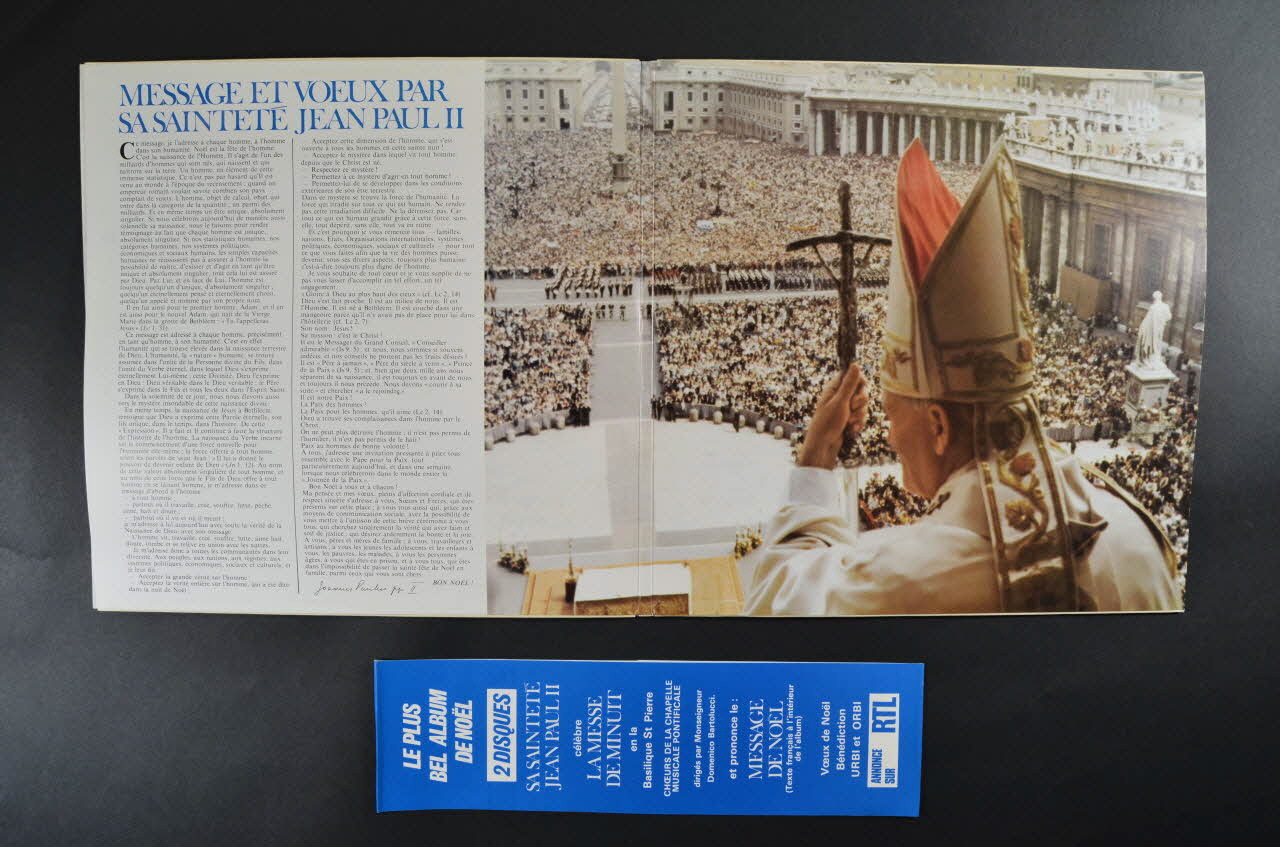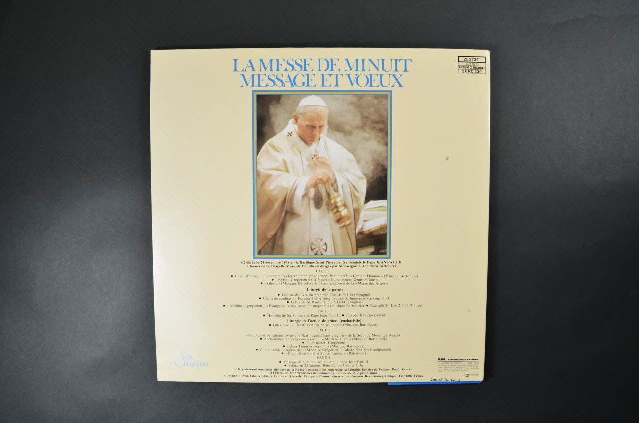 Le verso se compose du même fond ivoire avec en partie supérieure une photographie du Pape tenant un encensoir. Dessous figure le programme des disques, en noir.