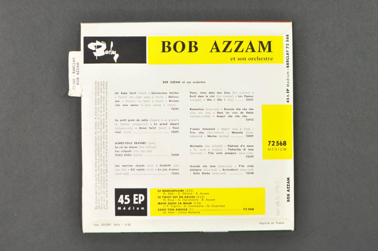 Le disque rond et noir comporte une perforation circulaire au centre. Une étiquette orange et jaune contenant le nom du chanteur, le titre des chansons, le logo de l'éditeur ainsi que d'autres inscriptions en noir est collée au centre.