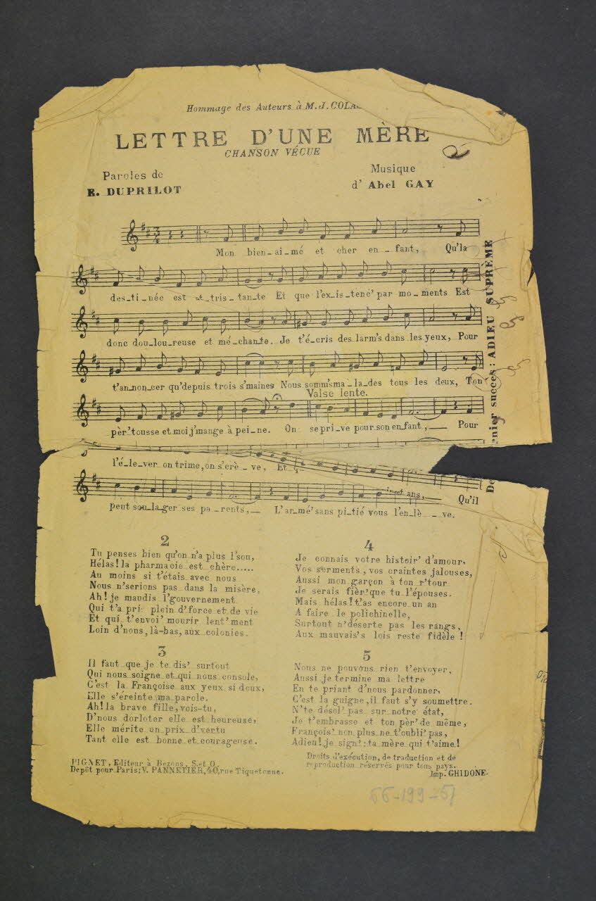 Les inscriptions renseignent le titre de la chanson, le nom des auteurs, de l'artiste et de l'éditeur. Au dos partitions et paroles de la chanson. L'intérieur est laissé vierge.Décor
