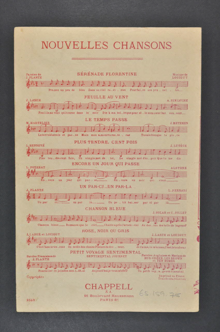 De : Lieu : Paris 8èmeDate : 1944paroles françaises / 86 bd Haussmann