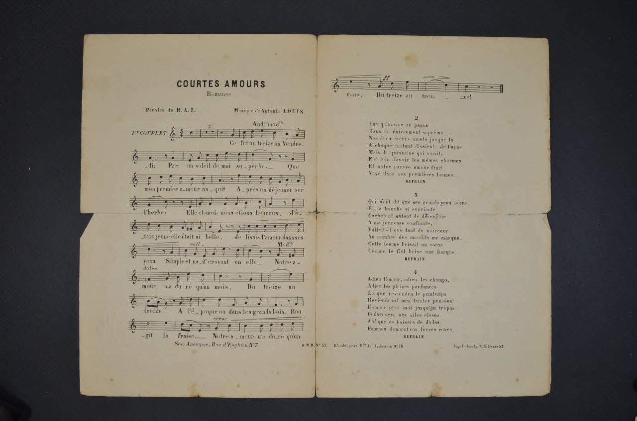 Les inscriptions renseignent le titre de la chanson, le nom des auteurs, de l'artiste et de l'éditeur. A l'intérieur, partitions et paroles de la chanson. Le dos est laissé vierge.Décor