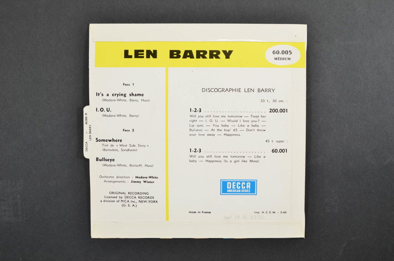 De forme carrée, la pochette est en carton, imprimée en couleur, pliée et collée. Les inscriptions sont en anglais. Une étiquette saillante se trouve au milieu du bord droit.