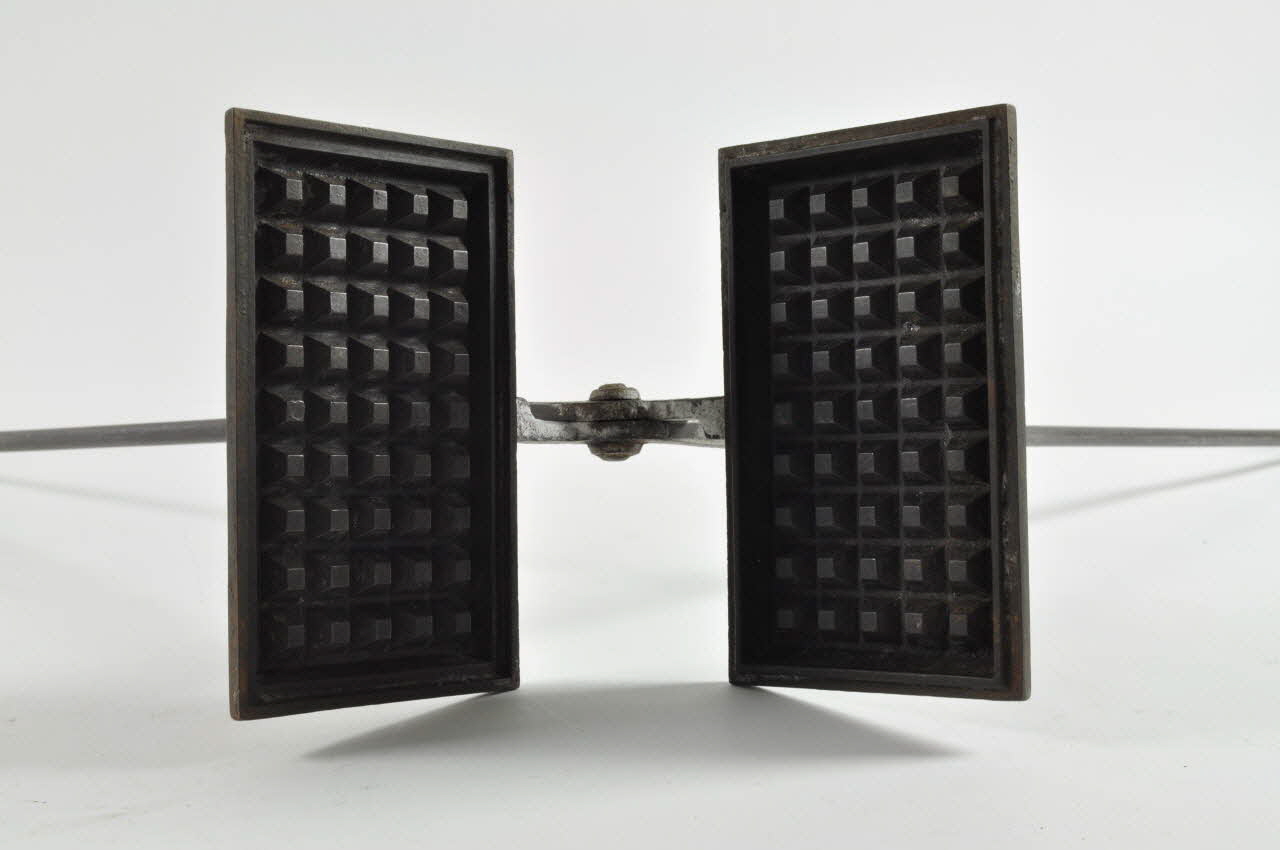 Moule à gauffres en fer avec deux branches cylindriques terminées par un cran et un anneau d'un côté, et d"eux extrémités en forme de coeur fixées par deux rivets sur deux plaques rectangulaires de l'autre.