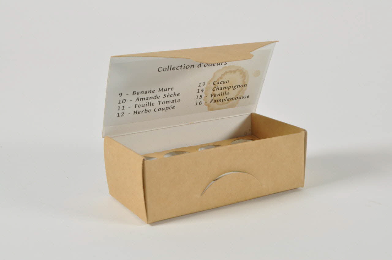 La boîte en carton de forme rectangulaire contient des échantillons d'odeurs numérotés de 9 à 16. Etiquette sur le couvercle de la boîte avec un dessin et une inscription mentionnant le contenu. Etiquette à l'intérieur de la boîte qui indique les différents parfums.