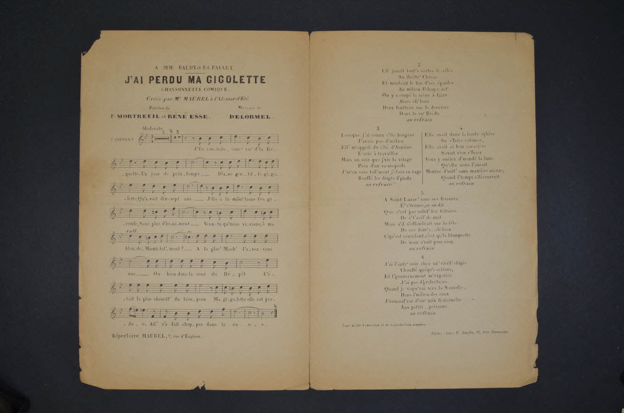 Les inscriptions renseignent le titre de la chanson, le nom des auteurs, de l'artiste et de l'éditeur. A l'intérieur, partitions et paroles de la chanson. Au dos, liste d?autres partitions publiées par l?éditeur.Décor