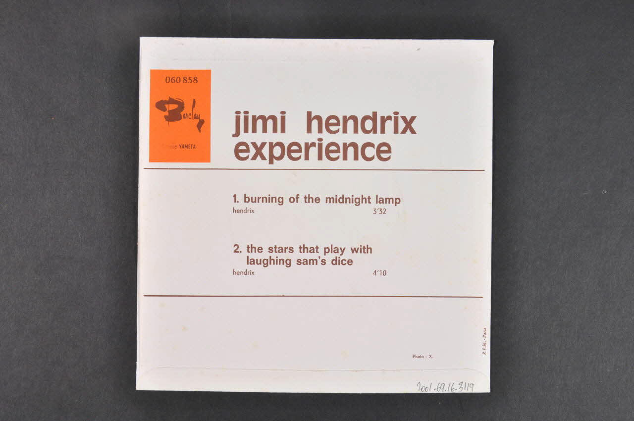 carrée. Elle est imprimée en couleur au recto et au verso. Les inscriptions sont en anglais. Au recto, le fond est blanc avec en haut, une inscription marron et orange, encadrée d'un rectangle marron. En bas, une photo, en marron et blanc, d'un joueur de guitare, entourée d'un rectangle orange. Au verso, le fond est blanc avec des inscription en marron. En haut à gauche, figure un logo orange.Matériaux et techniques