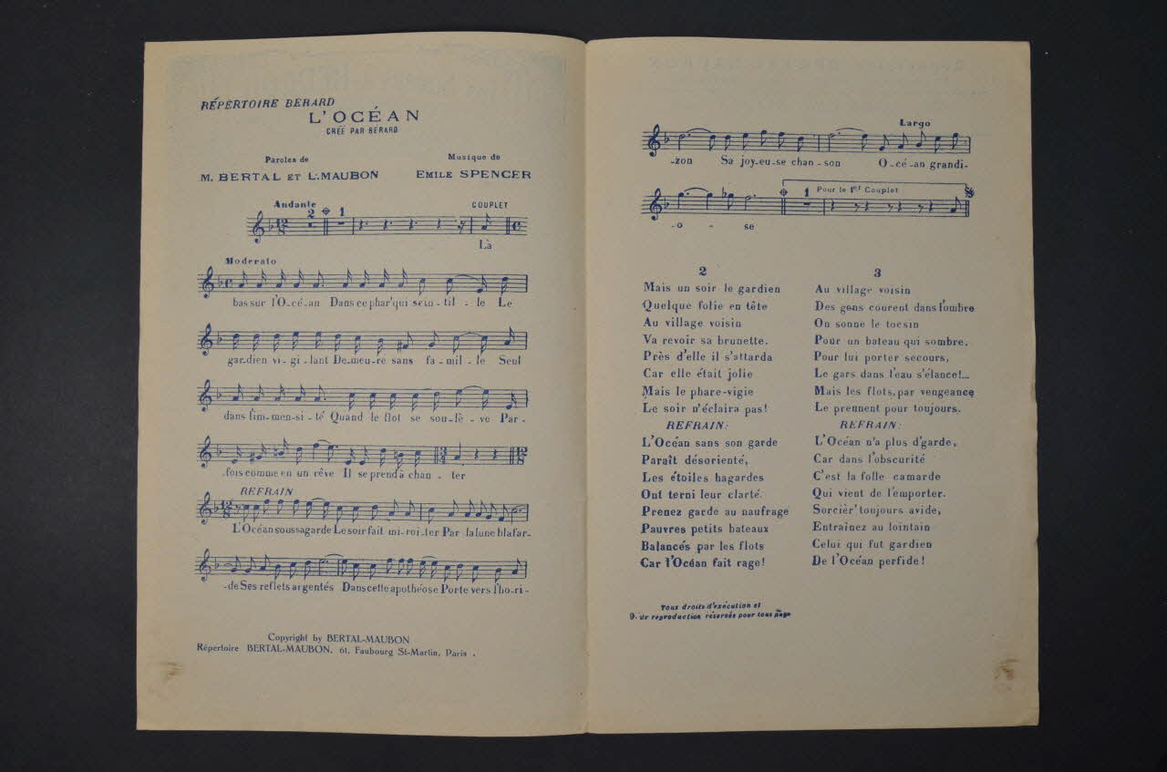 La première page présente la photographie de Bérard. Les inscriptions précisent le titre de la chanson, l'auteur et l'éditeur. A l'intérieur se trouvent la partition et les paroles de la chanson. Au dos se trouve une liste des morceaux disponibles chez le même éditeur.Décor
