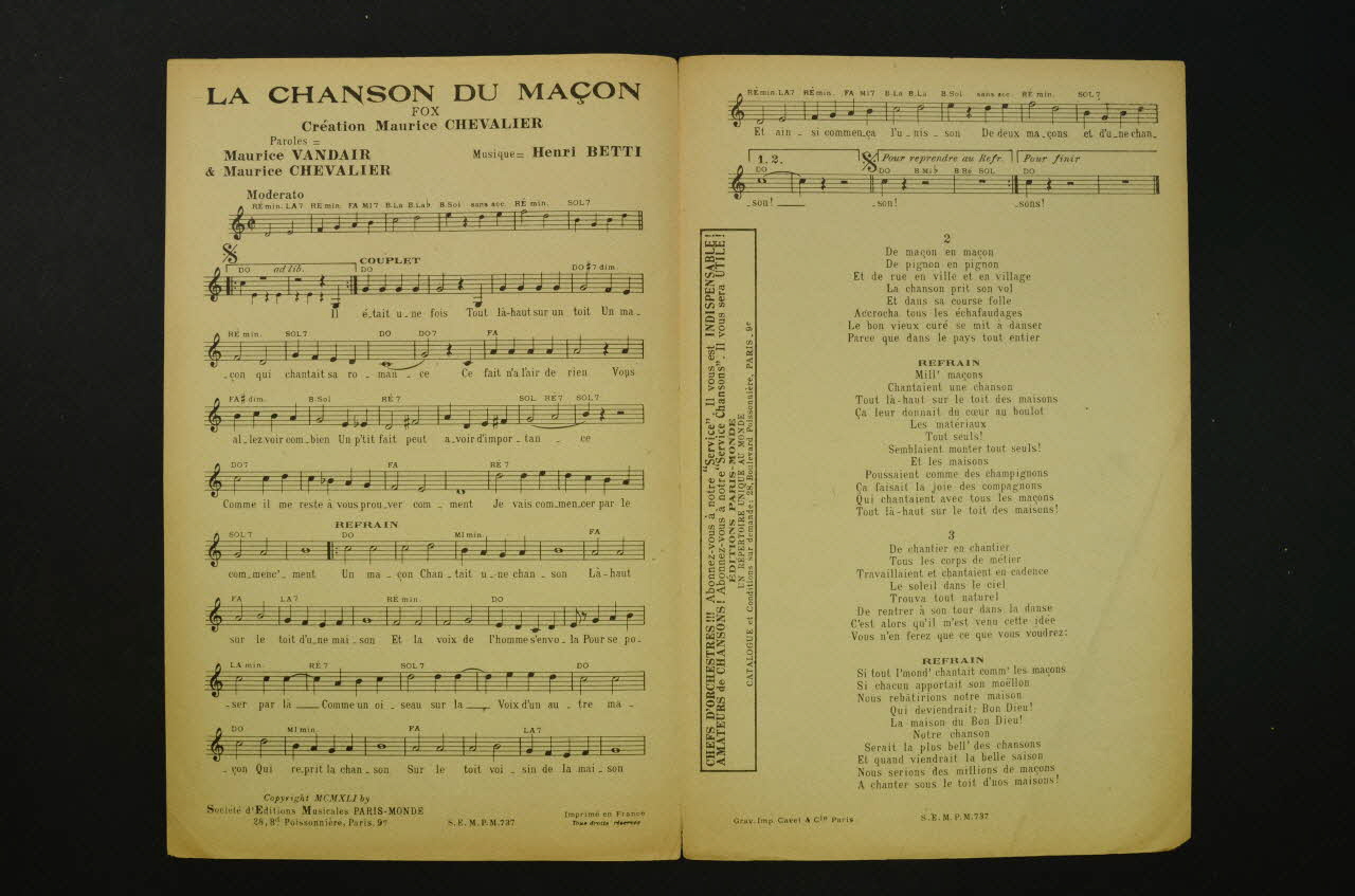 Feuillet rectangulaire en papier industriel imprimé à l'encre orange (sauf à l'intérieur, encre noire). Sur la couverture, un portrait photographique de Maurice Chevalier portant un chapeau et un dessin représentant des maçons construisant un bâtiment.