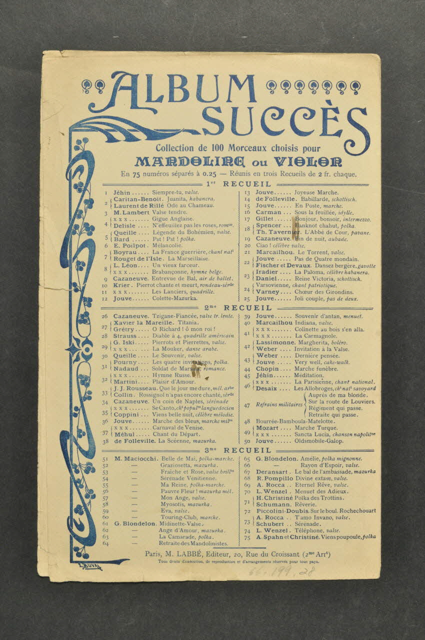 Des inscriptions renseignent le titre, les auteurs, les exécutants et l'éditeur. A l'intérieur, partition et paroles de la chanson. Au dos, liste d'autres partitions publiées par l'éditeur.Décor