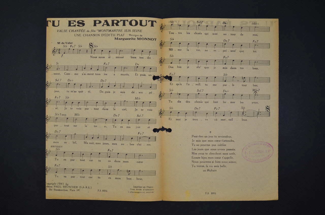 Feuillet rectangulaire en papier industriel, imprimé à l?encre bleue (sauf l?intérieur à l?encre noire). La couverture du feuillet présente des photographies d'Edith Piaf extraites du film "Montmartre-sur-Seine".