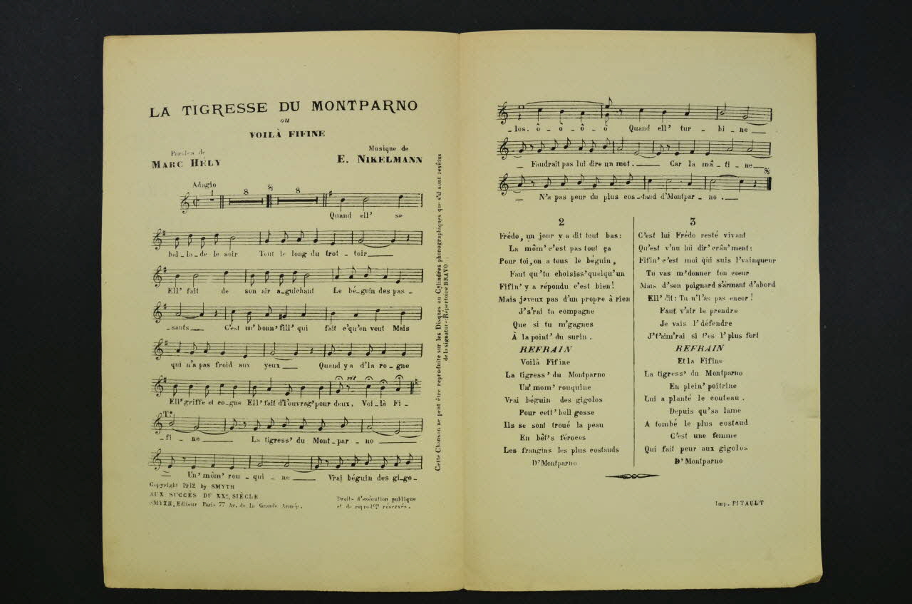 Les inscriptions renseignent le titre de la chanson, le nom des auteurs, de l'artiste et de l'éditeur. A l'intérieur, partition et paroles de la chanson. Au dos, liste d?autres partitions publiées par l?éditeur.Matériaux et techniques