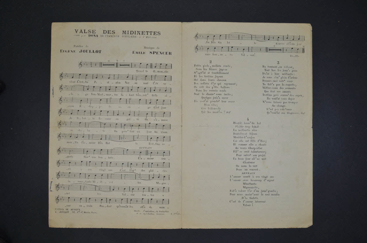 Les inscriptions renseignent le titre de la chanson, le nom des auteurs, de l'artiste et de l'éditeur. A l'intérieur, partitions et paroles de la chanson. Au dos, liste d?autres partitions publiées par l?éditeur.Décor